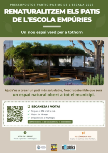 A l’Escola Empúries estem il·lusionats amb un projecte que neix del treball conjunt de mestres, alumnes, AMPA i entitats del municipi: la renaturalització del pati. Hem presentat aquesta iniciativa als Pressupostos Participatius amb l’objectiu de transformar aquest espai en un entorn més saludable, sostenible i obert a tota la comunitat.
