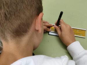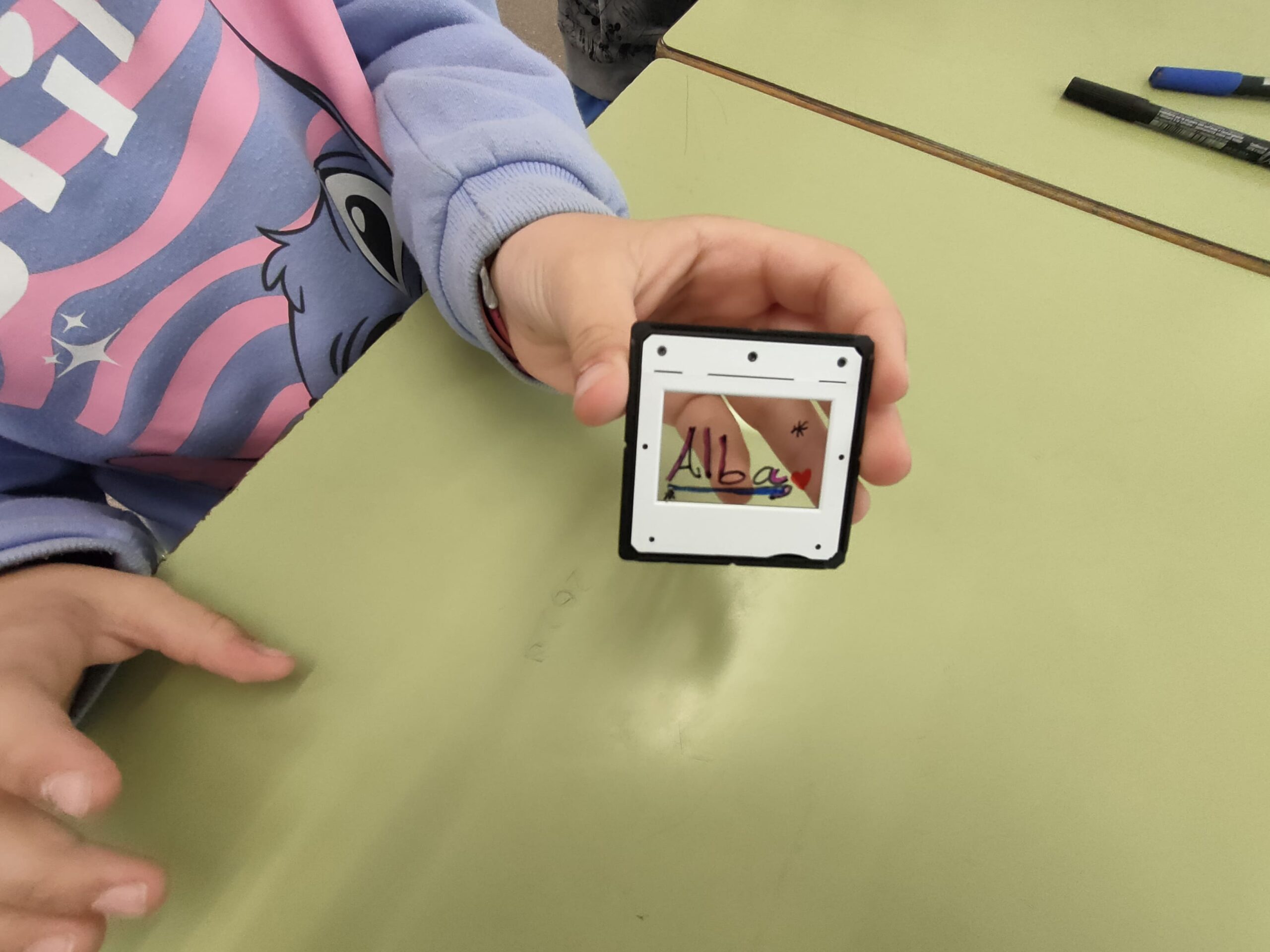 Així doncs, l’alumnat de 3r, 4t i 5è, hem utilitzat retoladors permanentsi diverses plantilles , per tal d’escriure les nostres inicials, noms o paraules en diapositives antigues. I, a més a més, les hem pogut decorar lliurement!
