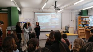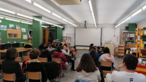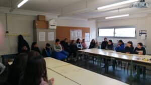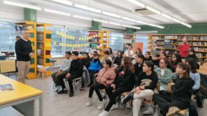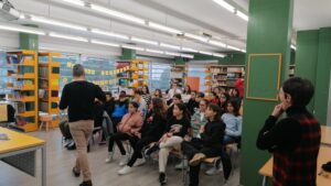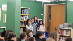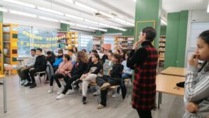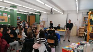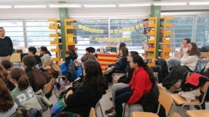 Ens han donat la benviguda a la biblioteca del centre i ens han explicat el seu funcionament a través de l’explicació del director i professorat del centre i a través d’alumnat de 1r d’ESO que ho ha presentat amb un caire vivencial i des del punt de vista de les noies i els nois del centre.