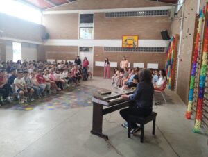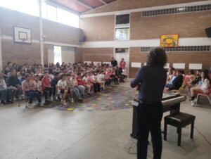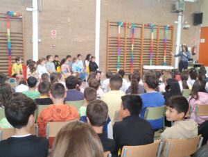 Per iniciar aquesta setmana tan especial, l’alumnat de primària ha tingut l’oportunitat de conèixer de prop el músic lleidatà Antoni Tolmos, una figura destacada del panorama musical del territori. A través d’una entrevista preparada pels mateixos alumnes, han pogut descobrir la seva trajectòria, la seva passió per la música i el seu procés creatiu. La trobada ha culminat amb un moment màgic: primer amb una improvisació al piano i, tot seguit, amb la interpretació de la seva cançó El teu nom, que tot l’alumnat ha pogut cantar conjuntament amb ell. Una experiència compartida que posa en valor la música com a llenguatge universal i eina d’expressió emocional. Com a record, ens ha obsequiat amb el seu llibre “Quan dubtes de tu. Autoestima per a artistes”, tant en català com en castellà i, també, el seu CD “A 4 mans”, un gest que reforça el vincle entre escola i creadors locals.