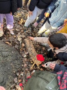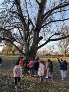 Finalment, i després de seguir pistes i explorar amb molta atenció, vam trobar el Tió ben protegit de fulles caigudes dels arbres del Bosquet. La il·lusió i l’alegria van ser compartides, convertint el moment en una vivència que de ben segur recordarem com a part del nostre camí d’aprenentatge i de la nostra identitat cultural.