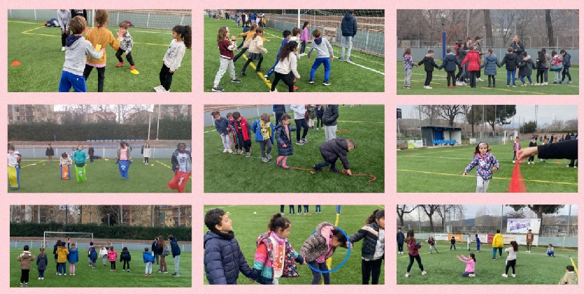 El 12 de febrer al matí, els alumnes de Primer Cicle (1r i 2n de primària) hem viscut una experiència molt especial al Camp de Futbol 1r de Maig. Hem participat en la Jornada de Jocs “Tots Junts”, una iniciativa organitzada pels alumnes de 2n d’ESO de l’Institut Antoni Cumella.