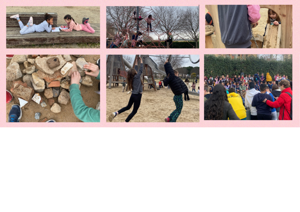 Aprofitant l’avinentesa, abans de tornar a l’escola, hem fet l’estona de pati al parc, on hem pogut jugar i fer volar la imaginació, practicant equilibris, improvitzant jocs de construcció amb pedres, fent joc simbòlic i fins i tot algú ha trobat un espai prou tranquil per la lectura. Ha estat una estona de pati diferent i enriquidora.