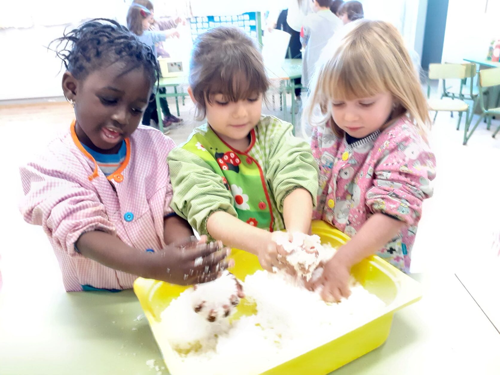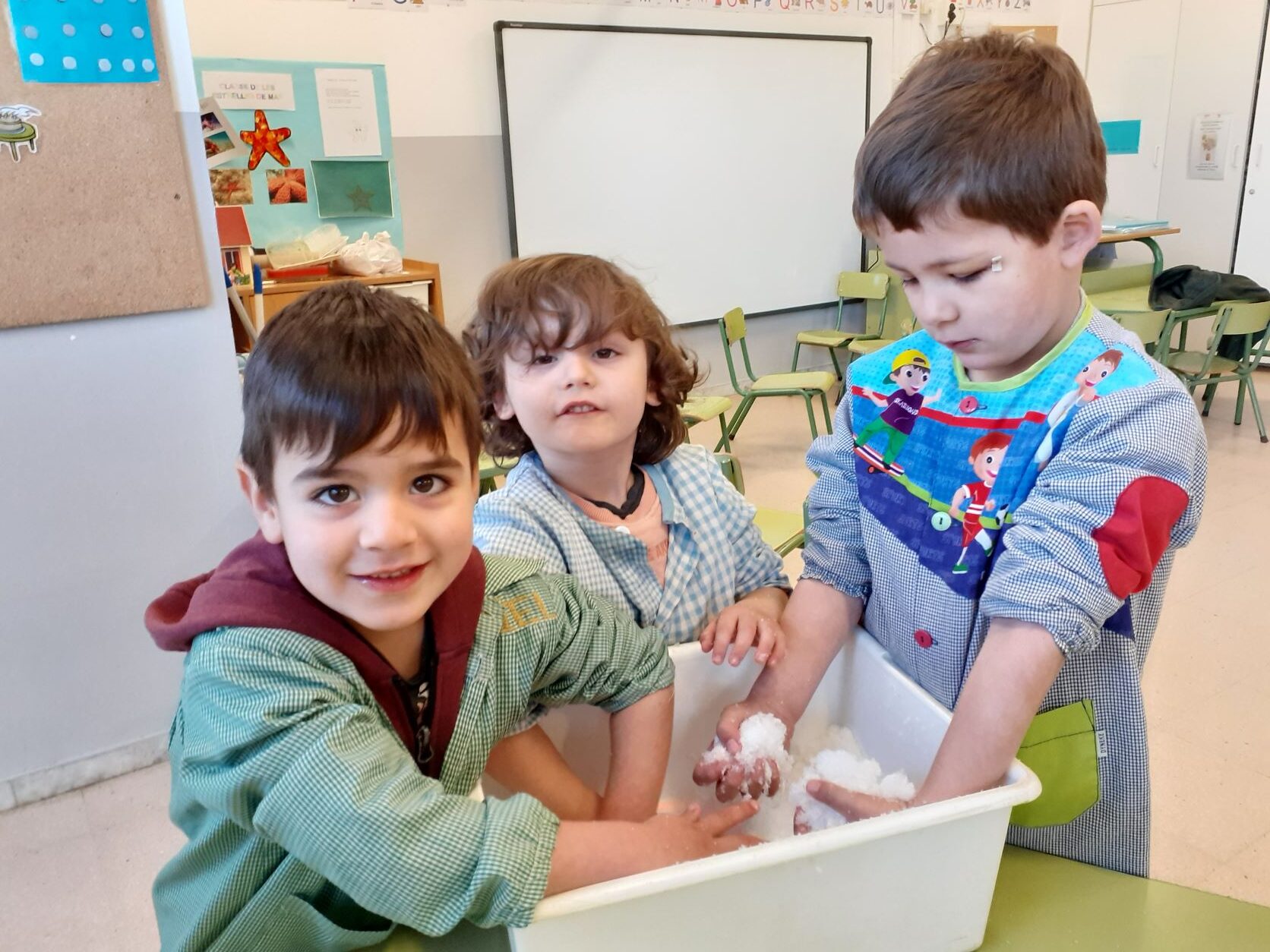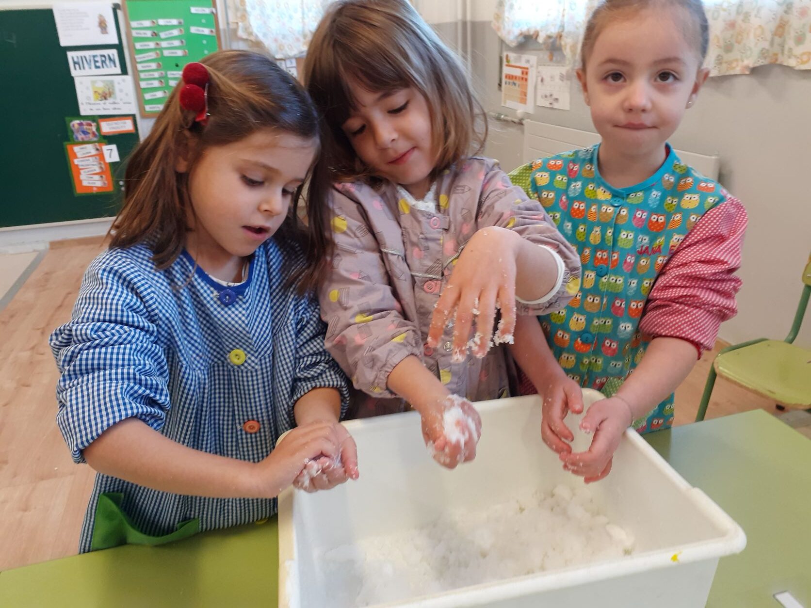 Les Estrelles de mar i els Dofins estem treballant l’hivern i tenim moltes ganes de poder tocar la neu, però, a Granollers no neva… és per això que durant aquests dies, a experimentació estem fent neu amb bolquers. Ens ho passem molt bé, ja que sembla neu de veritat, està freda, podem fer boles, ninots de neu… ⛄⛄
