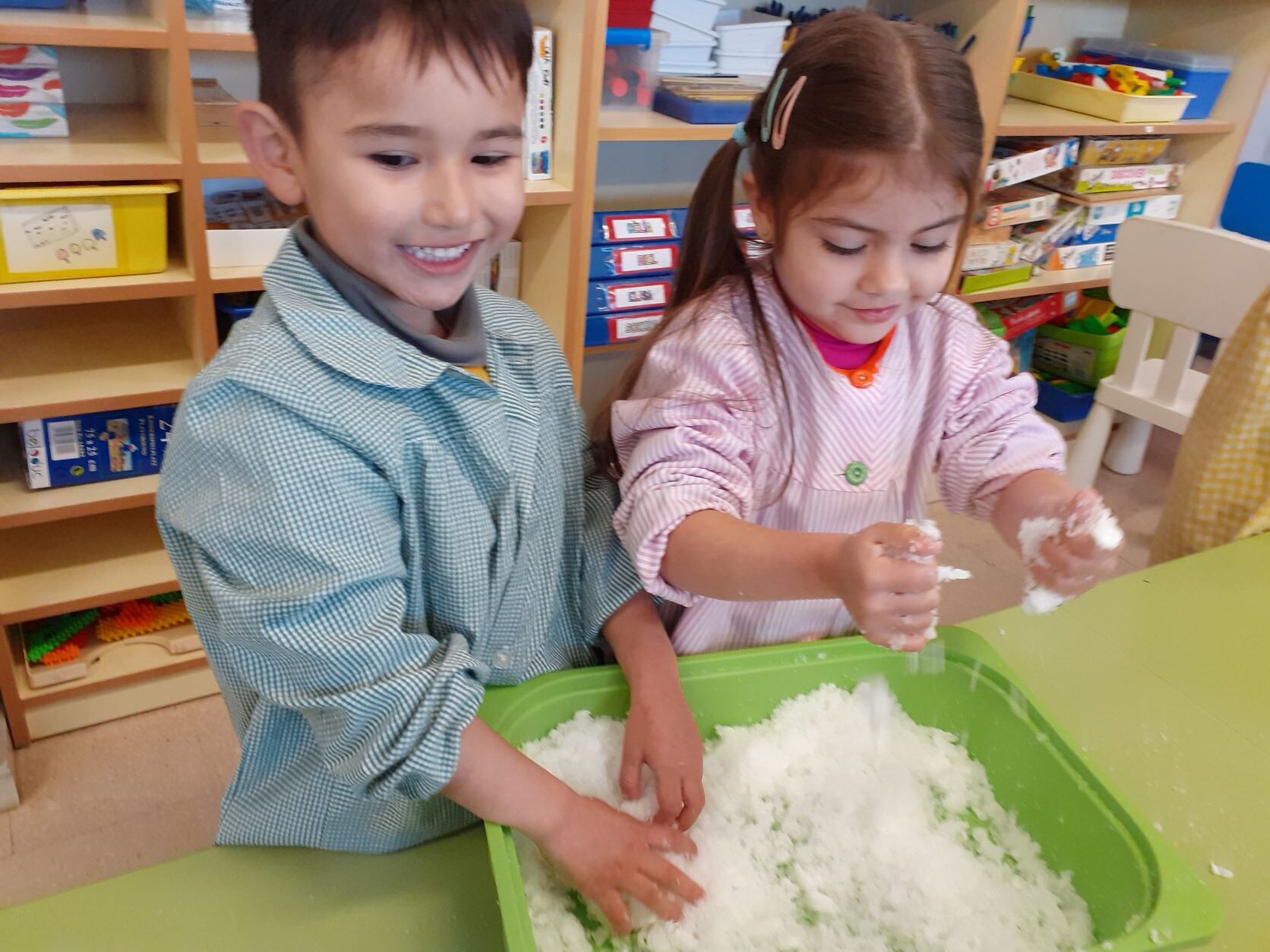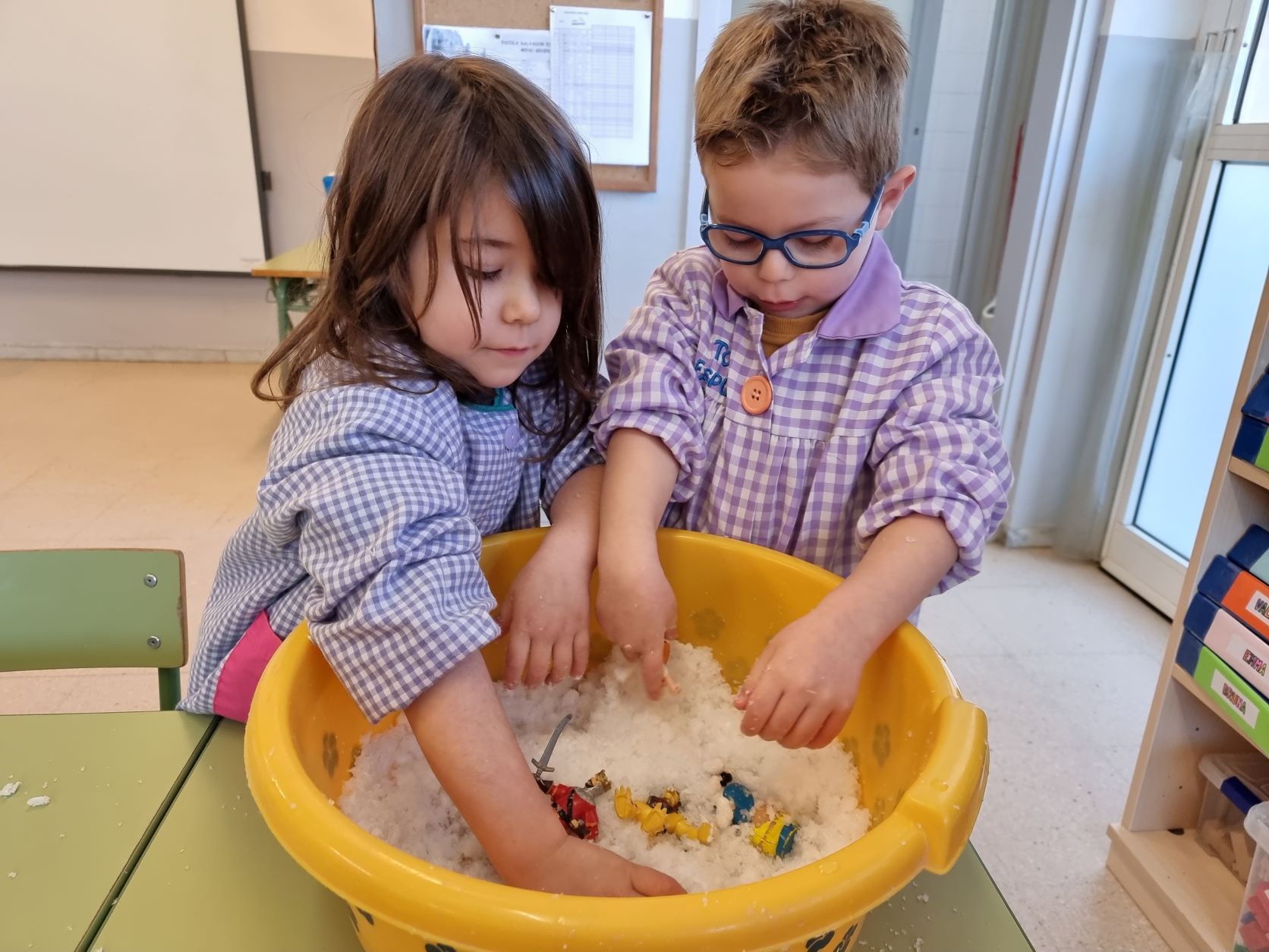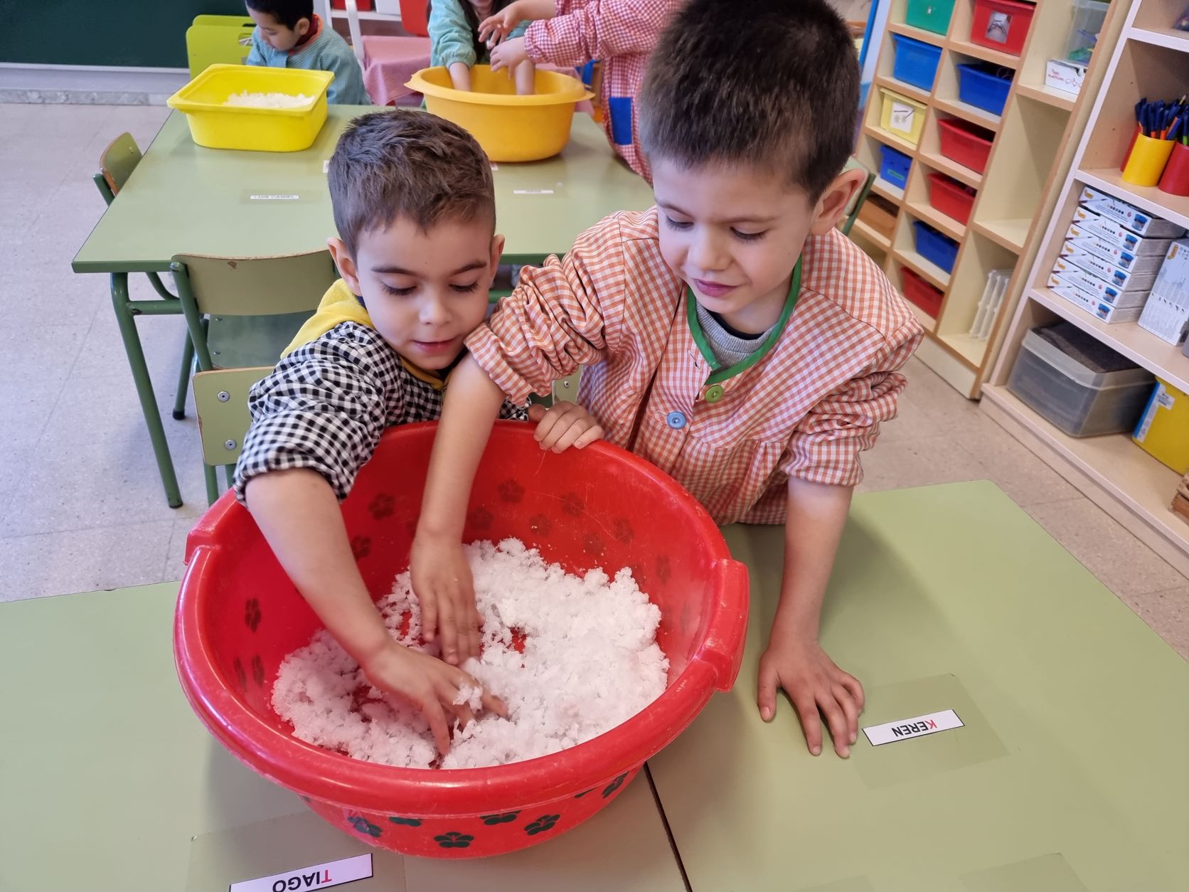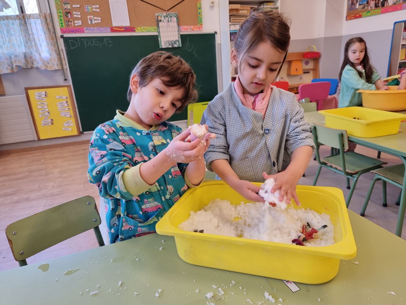 Les Estrelles de mar i els Dofins estem treballant l’hivern i tenim moltes ganes de poder tocar la neu, però, a Granollers no neva… és per això que durant aquests dies, a experimentació estem fent neu amb bolquers. Ens ho passem molt bé, ja que sembla neu de veritat, està freda, podem fer boles, ninots de neu… ⛄⛄