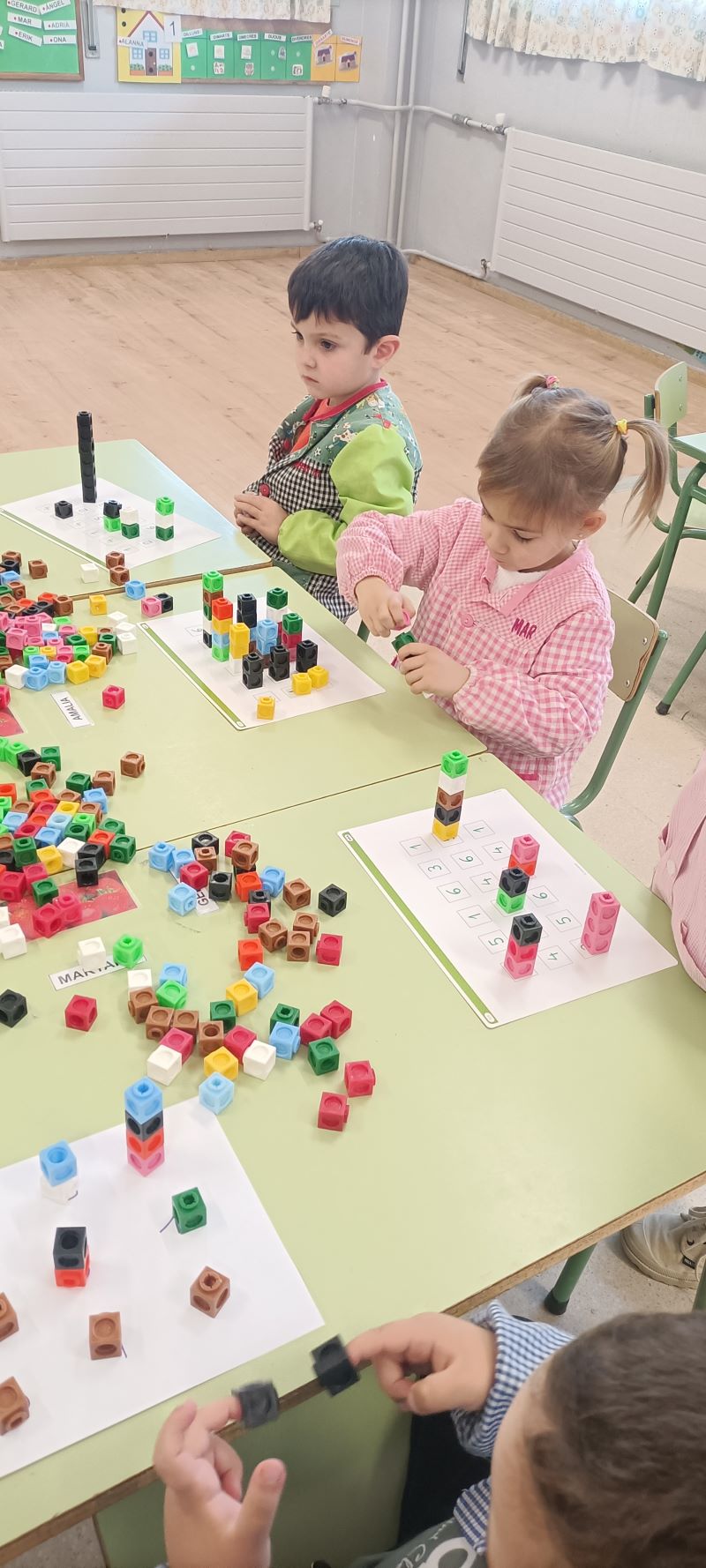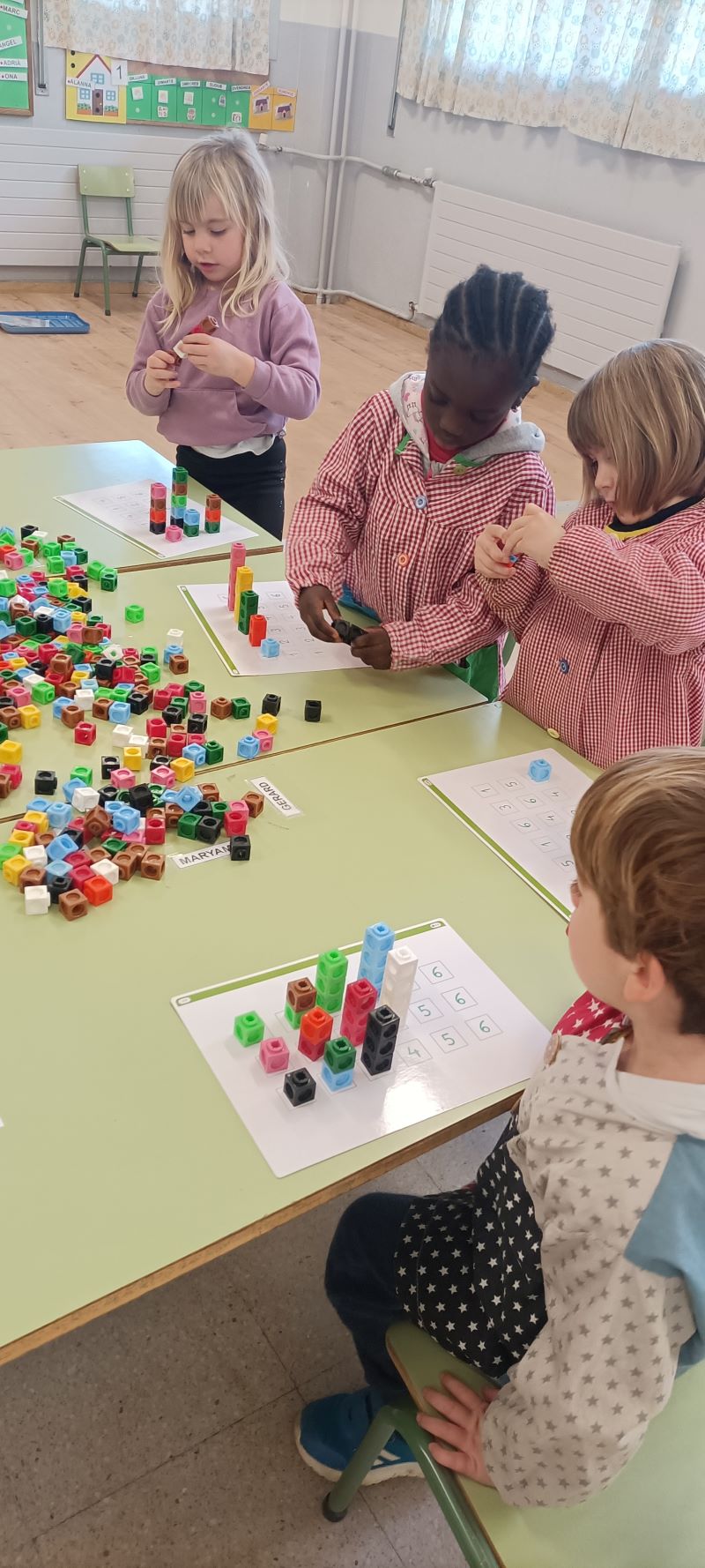 Cada setmana els nens i nenes d’I4 ens barregem i aprenem matemàtiques tot jugant amb material divers, com ara blocs lògics, cubilets, geoplans…