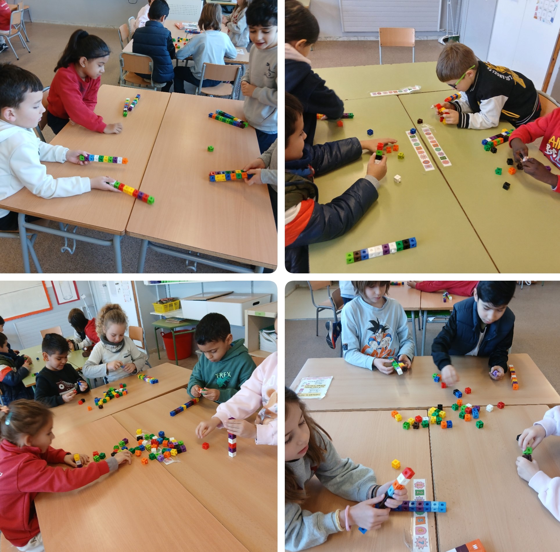 Mitjançant materials manipulatius agrupen de deu en deu i descobreixen que deu unitats en formen una desena.