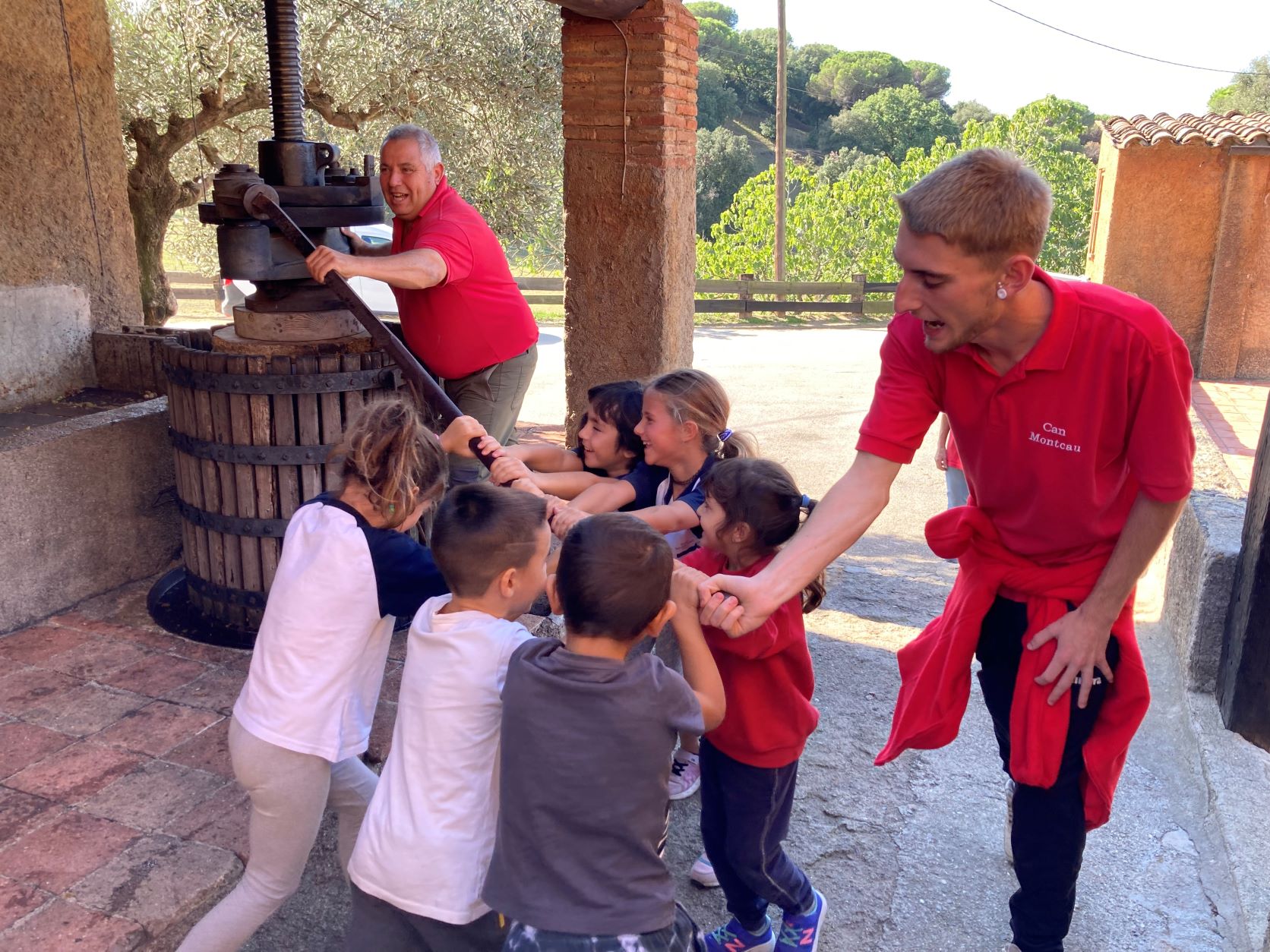 Vam caminar per les vinyes per observar els ceps i les seves parts (els sarments, el gotim, els pàmpols i els circells) i vam poder trepitjar plegats el raïm dins el cub de fusta i observar com en sortia del most.