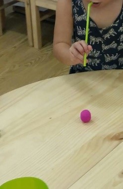 Fem córrer les boles per sobre la taula tot bufant amb una canya.