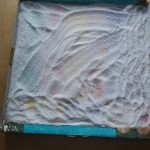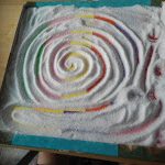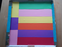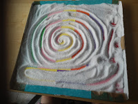 Agafeu una tapa d’una caixa, li enganxeu tires de paper de colors, l’ompliu de sal per sobre i … MÀGIA.