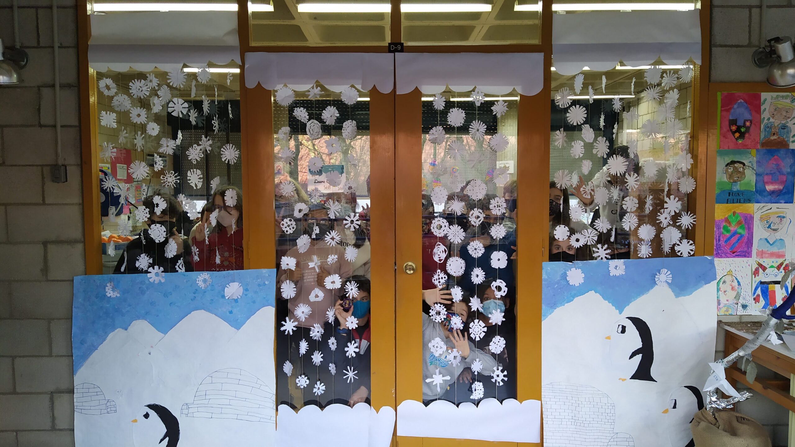 També vam decorar la porta de la classe, hi vam posar volves de paper i dibuixos de paisatges de nevats