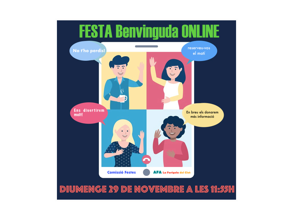 La comissió de festes ens demana que ens reservem el diumenge 29 de novembre a mig matí per celebrar, de manera virtual, la Festa de Benvinguda del Curs!