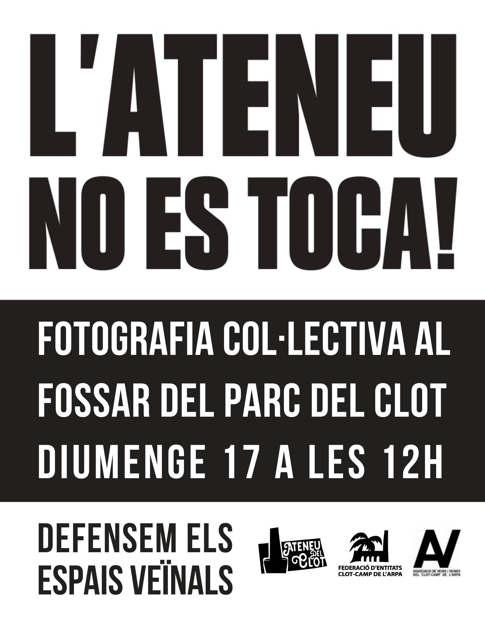 Defensem plegades els espais de trobada veïnal i no permetem que ens els prenguin. Us convoquem aquest diumenge 17, a les 12 h, al fossar del Parc del Clot, darrere les lletres “L’ATENEU NO ES TOCA!”