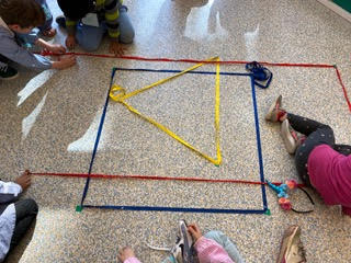 En la 1a sessió, els nens i nenes realitzen una dinàmica de cohesió de grup que té com a objectiu unir els punts que hi ha al terra per tal d’esbrinar quines formes geomètriques es van creant. Un cop superada aquesta prova, obrim la capsa sorpresa i expliquem un conte en el que les quatre formes geomètriques protagonistes tenen alguns problemes… però els acaben solucionant! Estan tan contents que acaben fent una festa, però necessiten la nostra ajuda! Així que els infants han d’ajudar-les a trobar el seu lloc en la festa, col·locant-les tal i com apareixen en les diferents fotografies proporcionades… a l’estil Tangram!