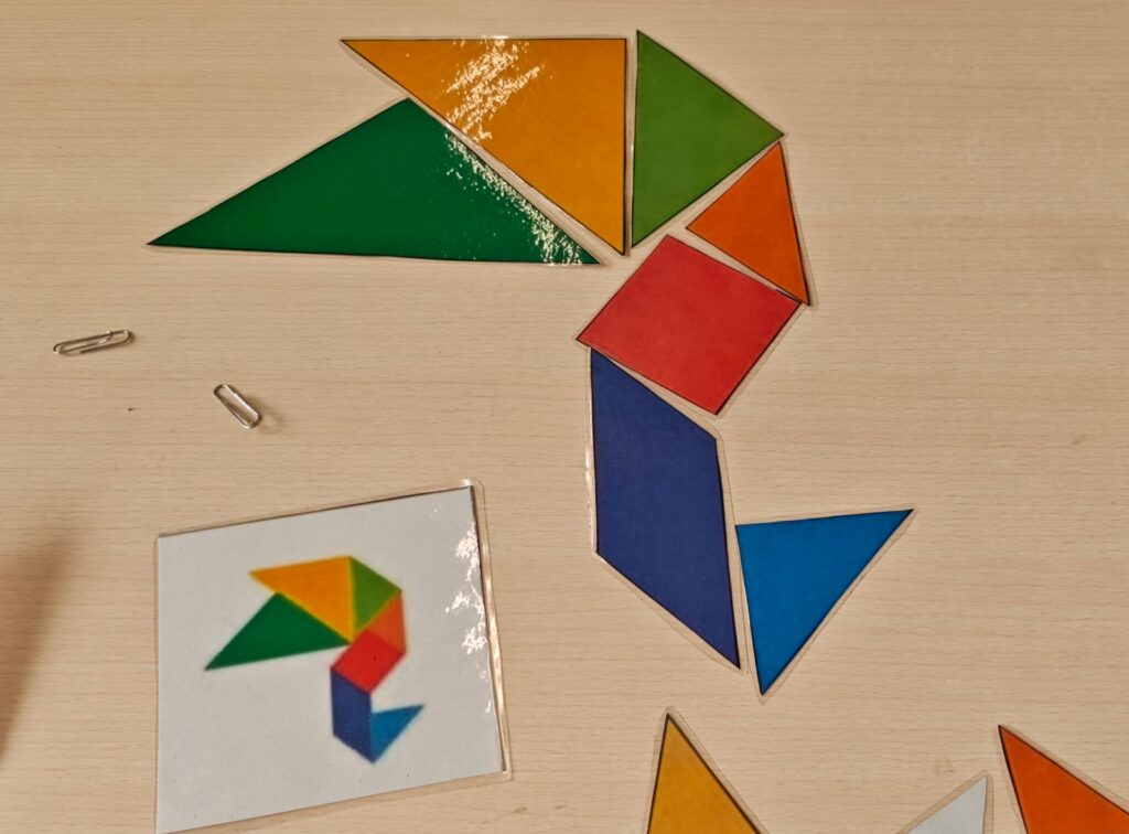 Comencem la sessió reconeixent diferents figures geomètriques, observant de manera activa i vivencial les seves diferències i trobant aquestes formes en els objectes que tenim al nostre voltant a la classe. Les agafem, les mirem per veure quina forma tenen, com són, quants costats podem comptar, si tenen puntes, si roden per terra…
