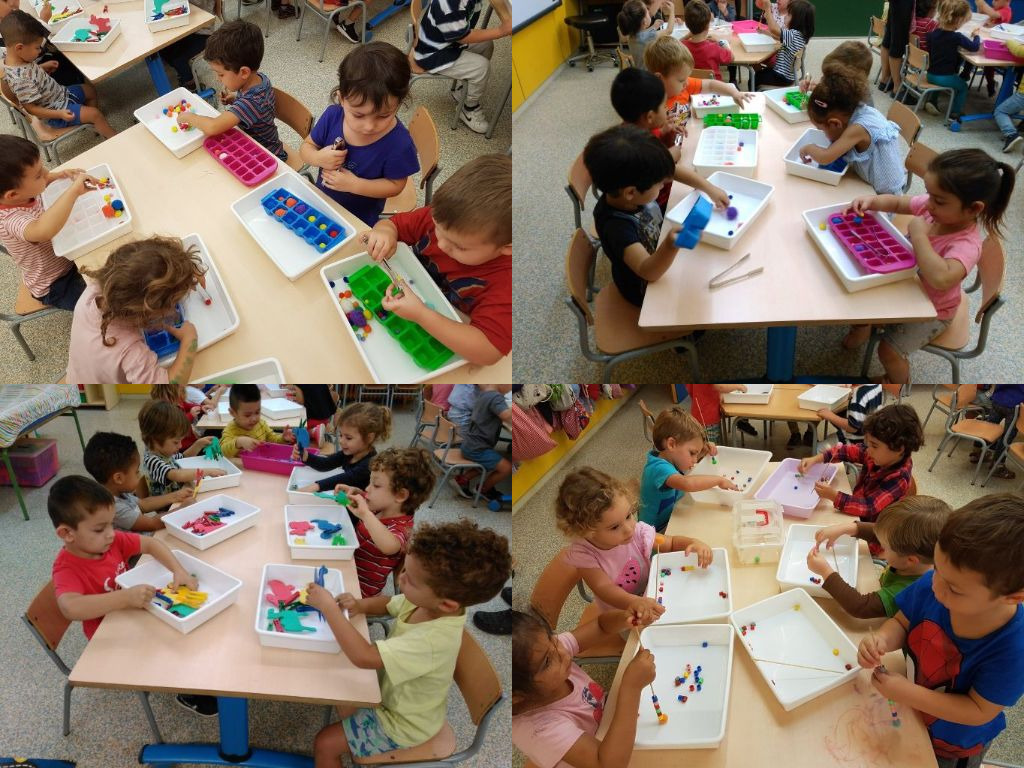 Els nens i nenes d’infantil treballen la motricitat fina amb l’ajuda de material sensorial i objectes quotidians: fer collarets, jugar amb les pinces d’estendre, amassar plastilina, esquinçar papers, fer boletes de paper, retallar amb les tisores, punxar amb el punxó…