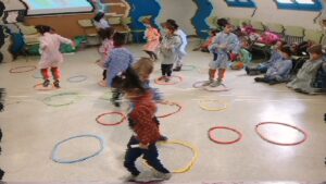 També ho hem picat amb instruments, caminat, ballat i hem associat una figura d’un animal a les intensitats. Ho hem treballat identificant fort-fluix saltant als cercles. Al final hem acabat amb uns massatges fent servir les figures dels animals treballats (massatge de formiga, de lleó i d’elefant)