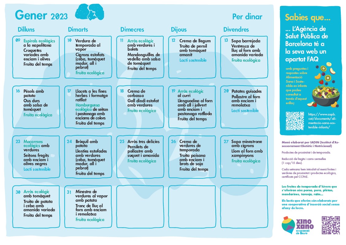 Tal com us vam anunciar a l’anterior Informació Setmanal, durant els dies de les vacances vam publicar al nostre web el menú previst per al mes de gener, la proposta de sopars i els menús adaptats.