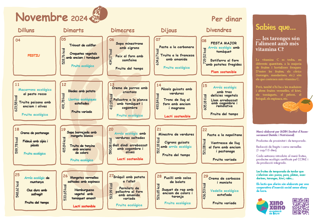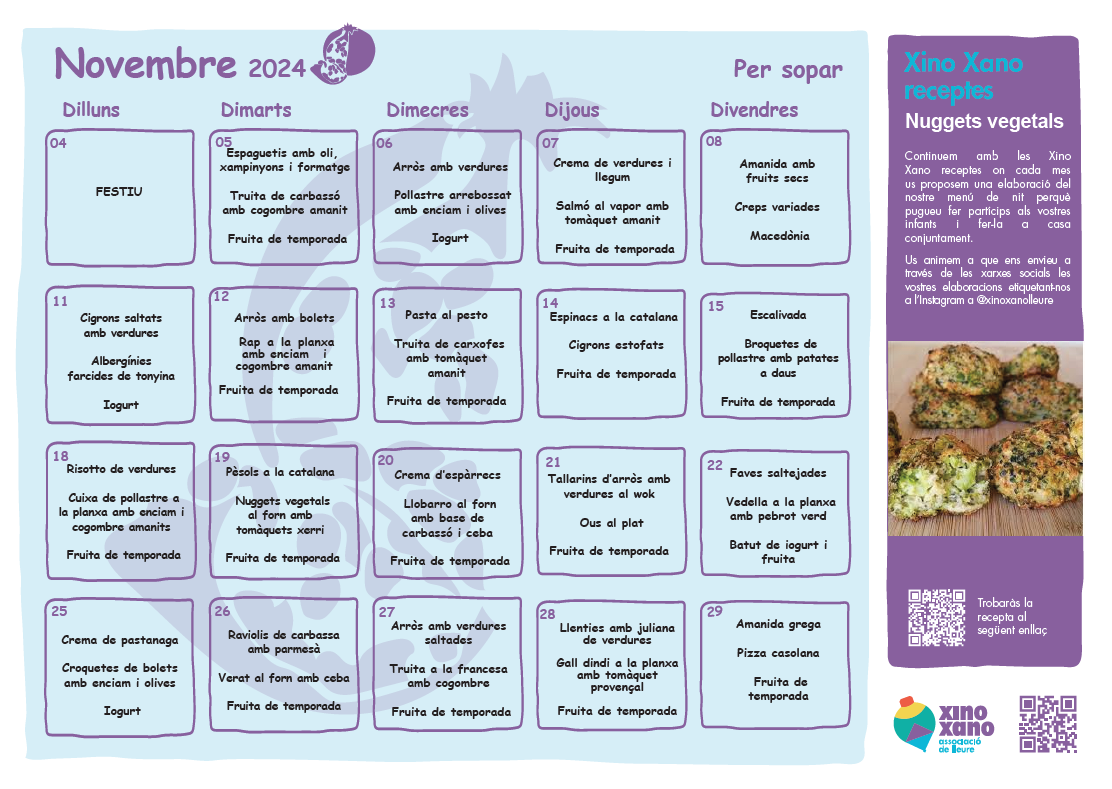 Arriba el mes de novembre i amb ell, la “Festa Major”. Us hem preparat un nou menú per aquest mes. Us animem a preparar amb els vostres infants la rica recepta que us oferim i que publiqueu una foto a Instagram i ens etiqueteu @xinoxanolleure