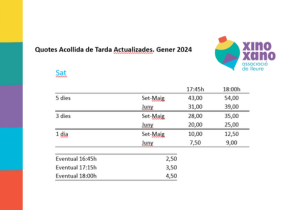 Donada la demanda d’algunes famílies hem incorporat una quota nova d’acollida de tarda de modalitat d’un dia (adjuntem imatge amb la nova quota). Esperem que pugui cobrir les necessitats vers aquest servei.
