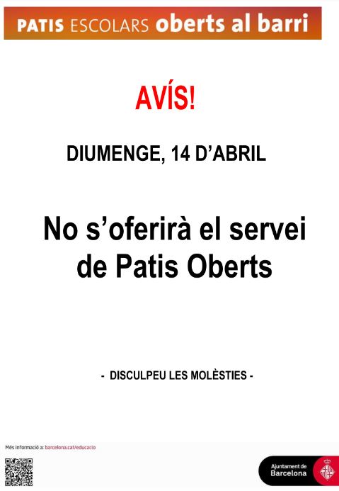Patis oberts: servei anul·lat el 14 d’abril Feu un comentari / Informació Setmanal / Per admin Degut a una intervenció de manteniment del nostre pati, el servei de patis oberts quedarà suspès durant el diumenge 14 d’abril. Us esperem, de nou, el pròxim diumenge 21 d’abril Disculpeu les molèsties