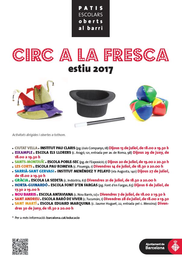 Patis oberts… també a l’estiu! Feu un comentari / Informació Setmanal / Per admin Us fem arribar els cartells de les obertures, les dinamitzacions i del cicle de Circ a la fresca que es faran en període de vacances d’estiu (del 26 de juny al 31 de juliol) al nostre districte.