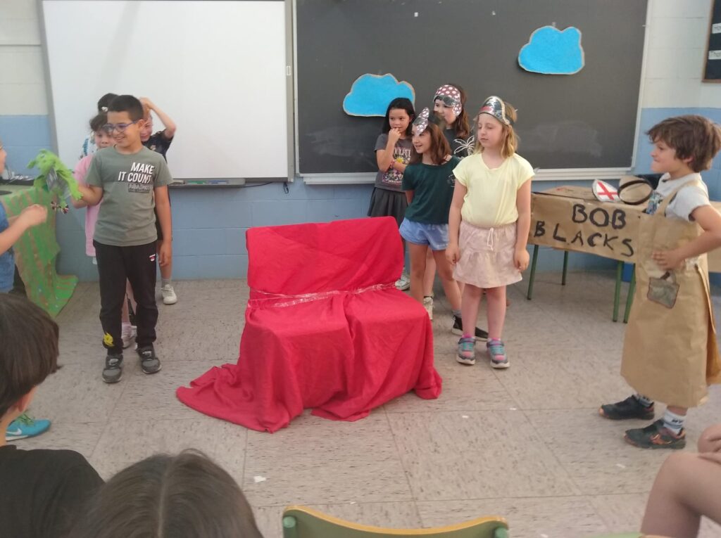 Les classes de Lletres i Periodistes de 2n han estat assajant molt aquest trimestre per a la seva obra musical “La Georgina i el Drac”, i finalment va arribar el moment de representar-la davant dels nostres padrins de 6è. Ho vam organitzar tot i vam fer unes invitacions perquè el públic sabés quan i on venir a veure’ns. El dia de la representació estàvem molt emocionats i una mica nerviosos, però gràcies a la feina feta, tot va anar molt bé i tothom va fer una gran actuació. L’alumnat de 6è ens va felicitar al final, i en alguns casos vam tenir una mica de temps per jugar jocs en llengua anglesa junts al pati. Creiem que els vam sorprendre; no s’esperaven que els nostres víkings i pirates fossin tan entremaliats i entremaliades!