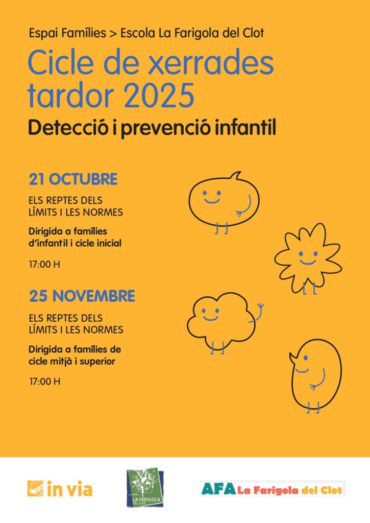 Us recordem que el pròxim dimarts, 25 de novembre, a les 17 h, totes les famílies des de 3r fins a 6è esteu convocades al menjador de l’escola perquè hem organitzat, juntament amb l’AFA, un taller gratuït sobre la importància dels límits dintre de la criança i l’acompanyament que fem als infants.