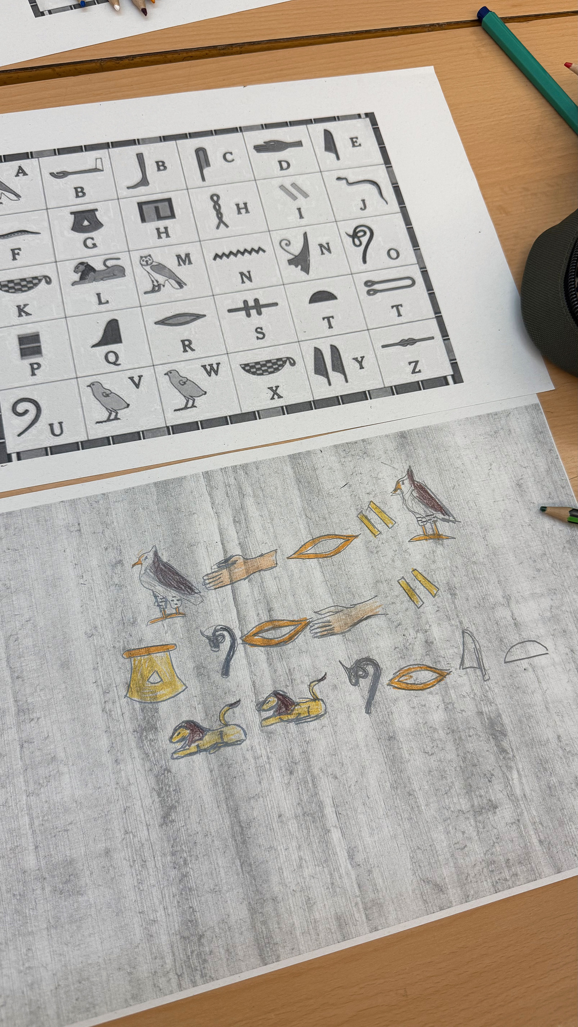 Dins d’aquest viatge històric anem fent pinzellades artístiques per posar-nos en situació sobre quines eren algunes de les pràctiques més habituals de cada època. Després dels fòssils i les pintures rupestres, ens hem convertit en escrivans duent a terme transcripcions amb jeroglífics egipcis.