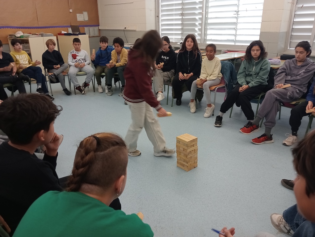 L’última activitat va ser una adaptació del famós joc, “Jenga”. D’un en un anàvem dient una cosa bonica d’un company o companya, sense que ell o ella ho sapigués i, al mateix moment, col·locàvem una peça del “Jenga”. Després havíem de fer el contrari, dir una cosa lletja, en aquest cas no anava dirigit a ningú, i treure una peça fins que l’estructura es va desmuntar. L’objectiu d’aquesta activitat era treballar aspectes relacionats amb l’autoestima.