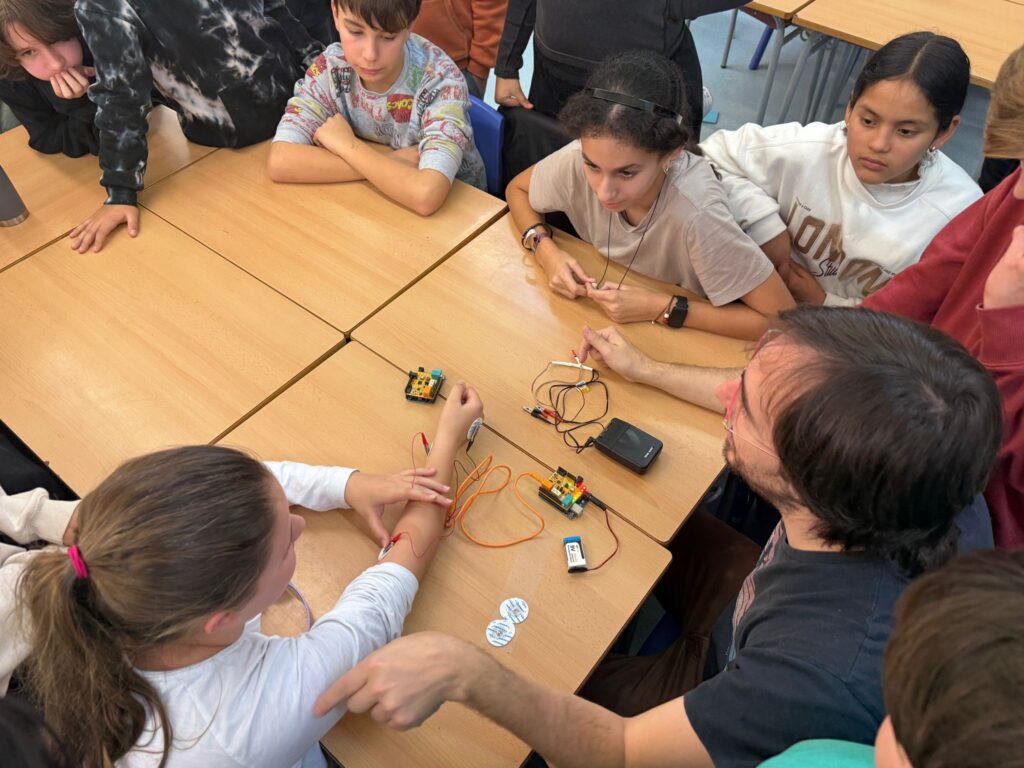 Una de les experiències que més ens ha sorprès ha estat la connexió d’elèctrodes al braç, que permetien transmetre energia a una pinça robotitzada i fer-la moure amb el simple gest del canell. Aquest tipus de tecnologia té un gran impacte en la vida quotidiana de moltes persones, com ara aquelles que utilitzen pròtesis biòniques o braços robotitzats.