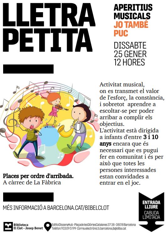 Activitat gratuïta a la Biblioteca El Clot – Josep Benet Feu un comentari / Informació Setmanal Portada / Per admin Activitat musical adreçada a infants d’entre 3 i 10 anys.