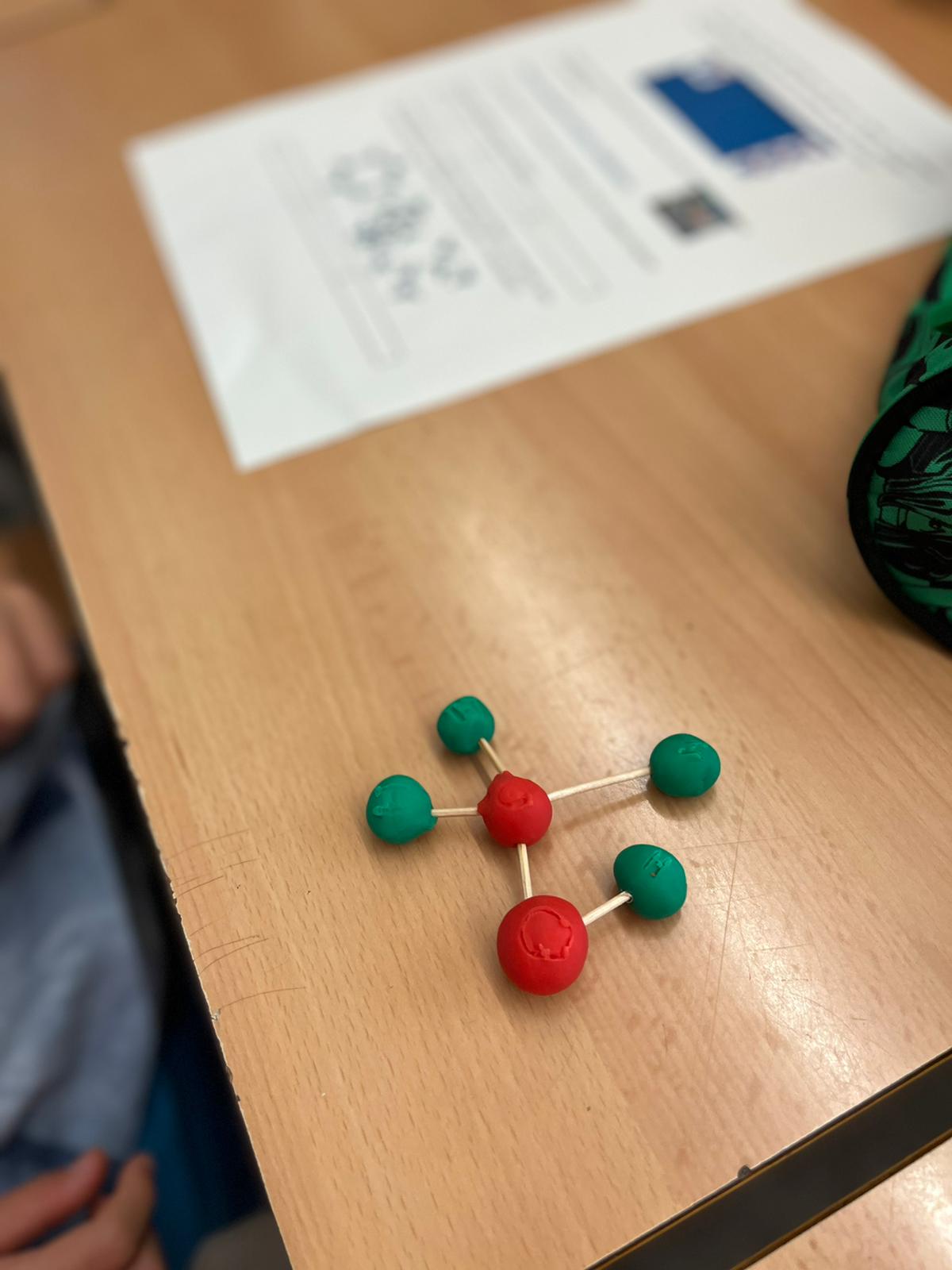 A les fotografies podeu apreciar les molècules d’aigua creades (1 àtom d’oxigen i dos àtoms d’hidrogen), així com la creació d’altres estructures (inventades) per entendre què es produeix quan hi ha una reacció química.