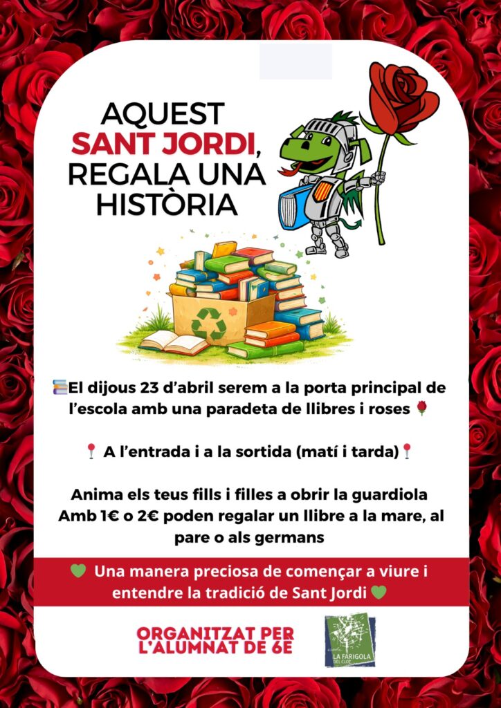 El dijous 23 d’abril, les famílies de 6è us convidem a passar per la nostra paradeta de Sant Jordi 🏫✨