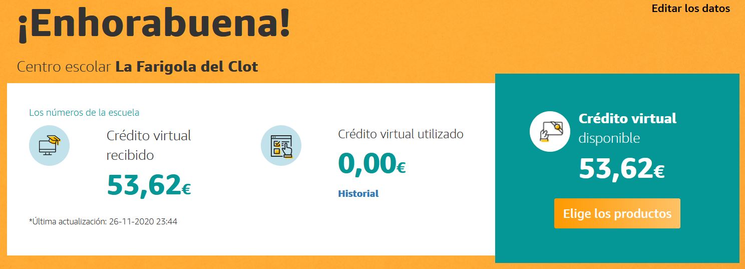 Tot i això, hem vist que ja tenim un crèdit virtual acumulat de 53,62 € que podríem utilitzar en la compra d’articles d’un catàleg que posen a disposició dels centres educatius.