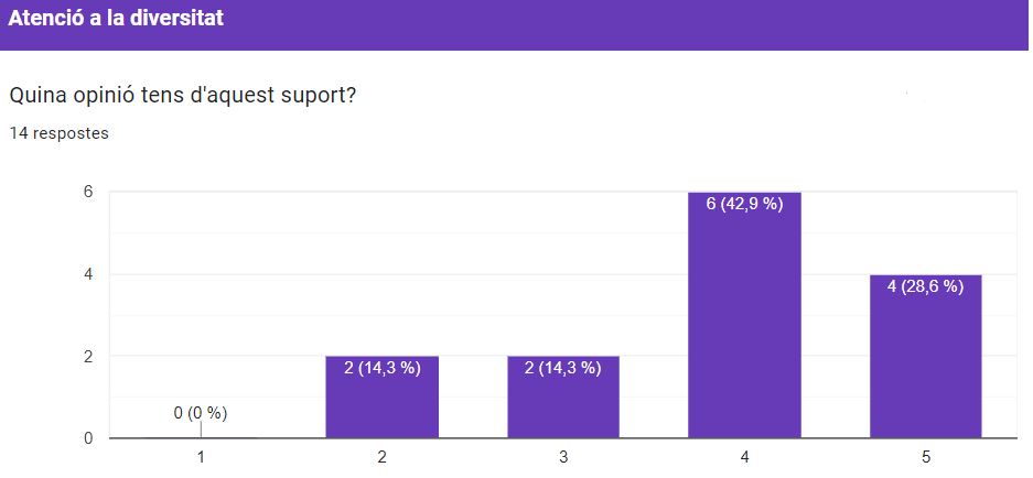 I acabem aquest resum de les vostres resposte amb una mirada cap a l’atenció a la diversitat. Aquesta pregunta només estava disponible per a les famílies que reben aquest suport i les seves opinions van molt en la línia de totes les anteriors. La satisfacció és generalitzada donat que un 71.5% de les respostes són positives o molt positives.