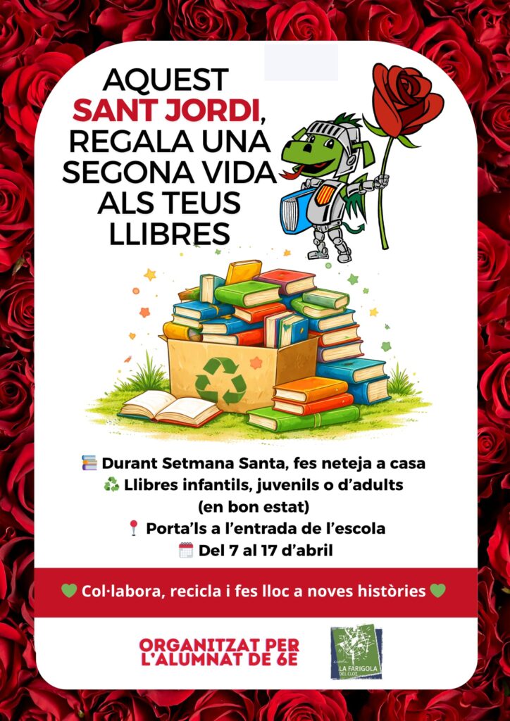 Escola: recollida de llibres per Sant Jordi Feu un comentari / Informació Setmanal Portada / Per admin Aquest Sant Jordi, els de 6è tindrem una paradeta a la porta de l’escola, en ella vendrem llibres de segona mà i demanem la vostra col·laboració una vegada més. Gràcies!