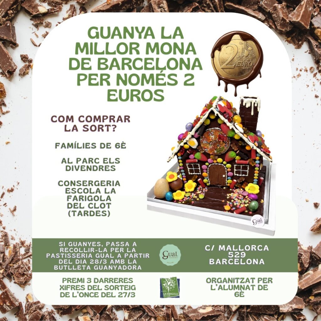 Escola: Sorteig Mona Pastisseria Gual Setmana Santa Feu un comentari / Informació Setmanal Portada / Per admin Els de 6è estem a tope! Sortegem una boníssima Mona de la pastisseria Gual per recaptar fons per a la festa de final de curs. Les butlletes són a només 2€, col·labora i prova sort!