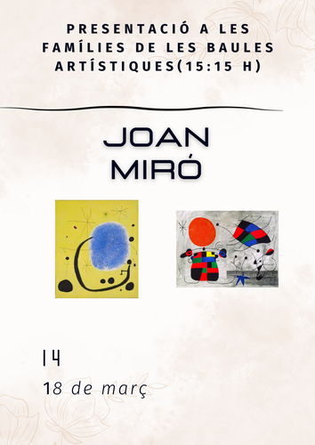Us recordem que el pròxim dimecres 18 de març tindreu l’oportunitat de venir a compartir amb nosaltres un moment molt especial: la presentació de la baula artística que els infants d’I4 han estat treballant inspirant-se en l’artista Joan Miró.