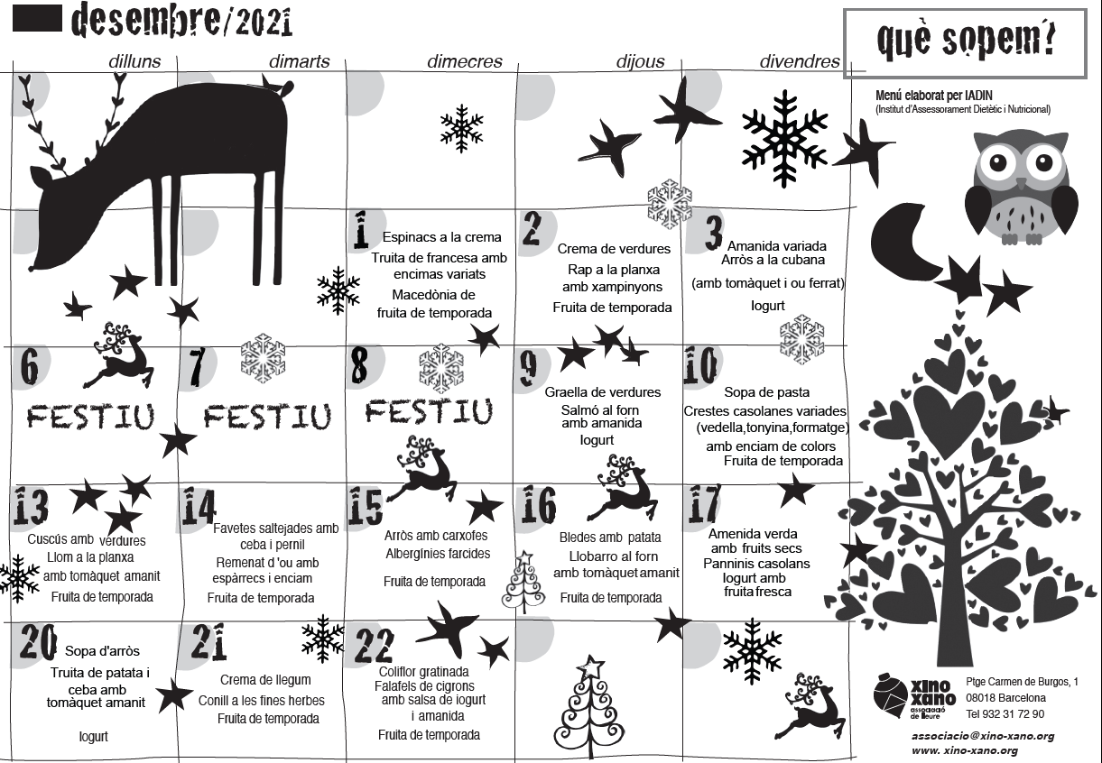 Us fem arribar el menú previst per al servei de menjador durant el mes de desembre juntament amb la proposta de sopars elaborada per la dietista de Xino-Xano.
