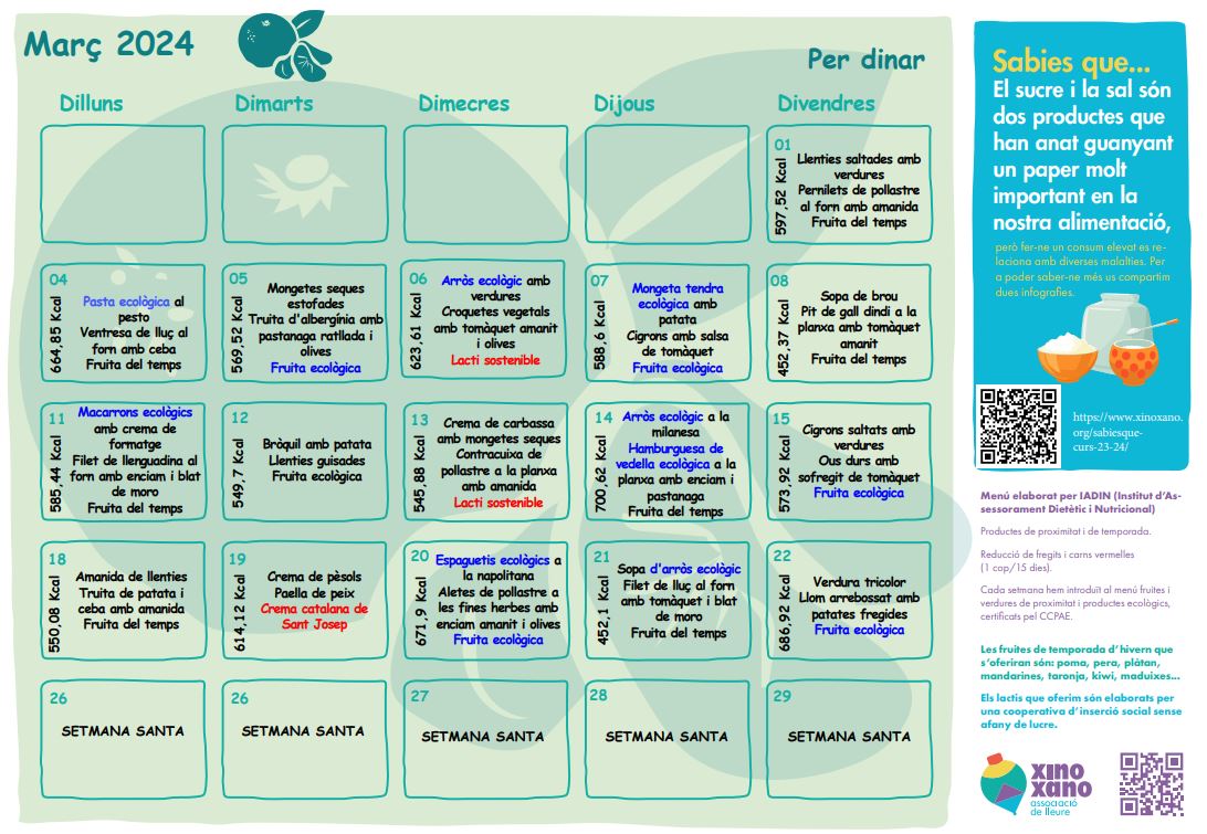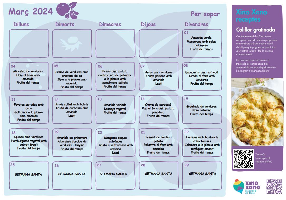 Avui comencem el mes de març i, per aquest motiu, us fem arribar el menú previst per a aquest mes.