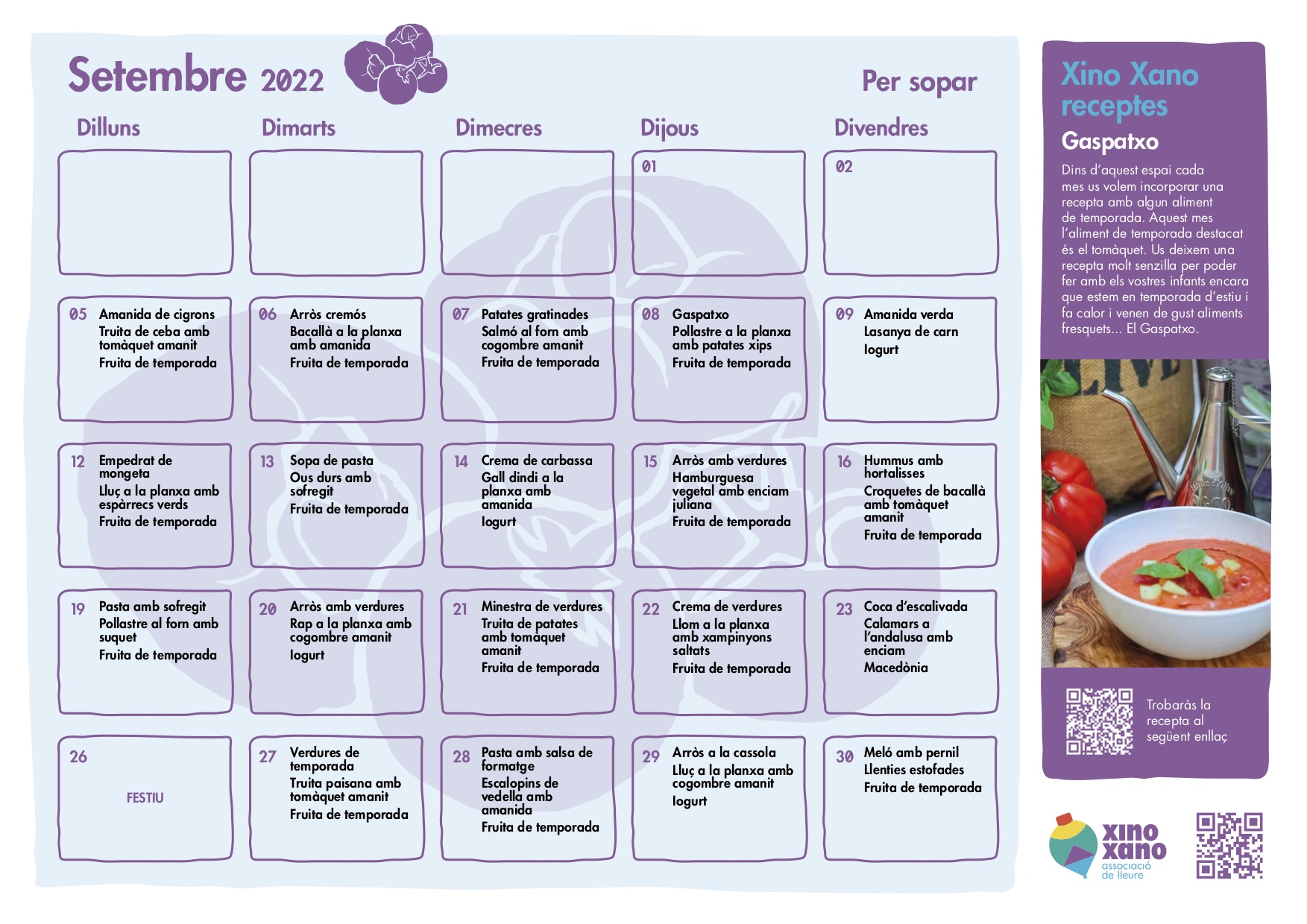 Dilluns començarà amb total normalitat el servei de menjador i Xino-Xano, entitat que gestiona el temps de migdia, ha sigut molt puntual com sempre i ja ens ha fet arribar el menú del mes de setembre i la proposta de sopars elaborats per la seva dietista.