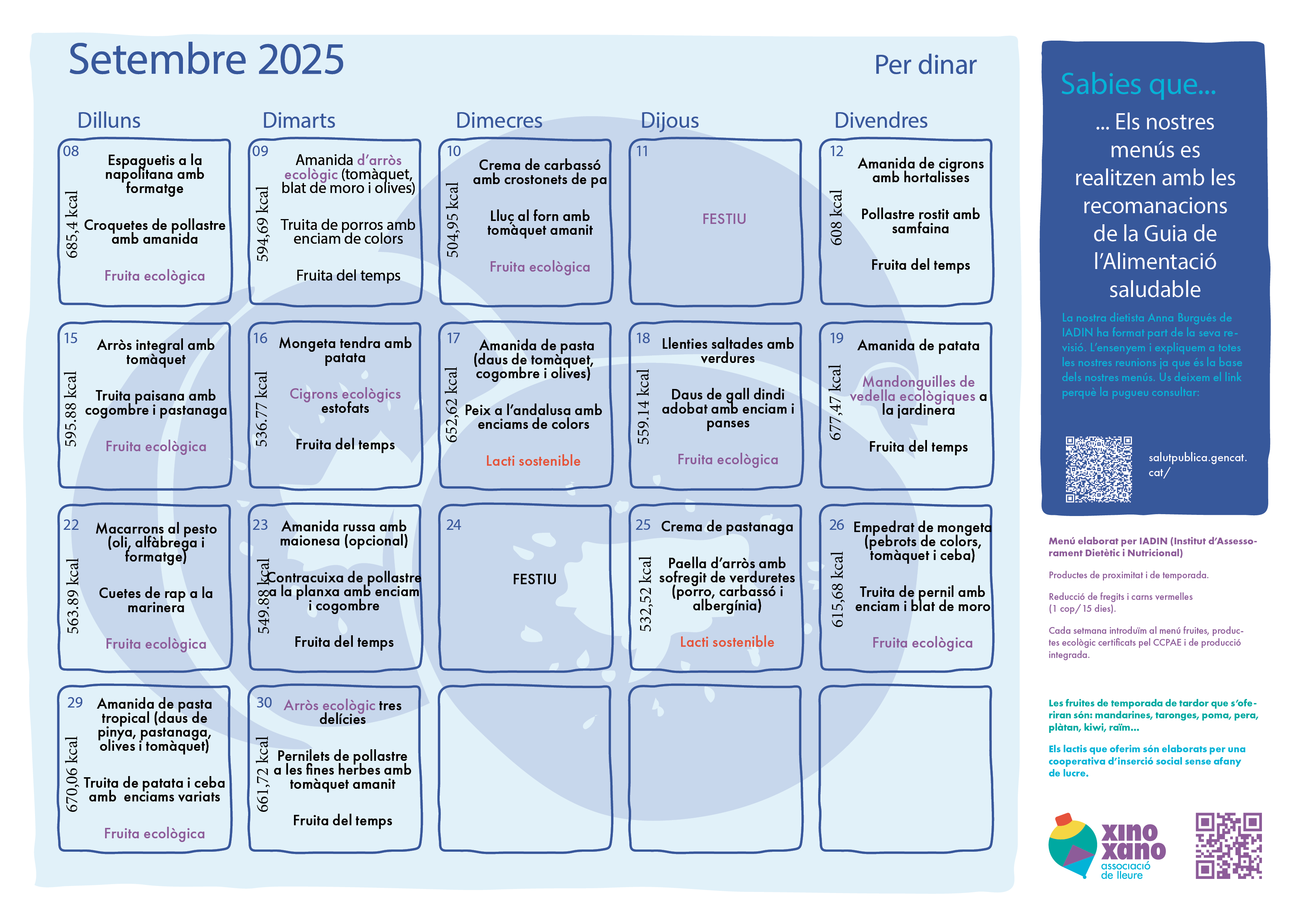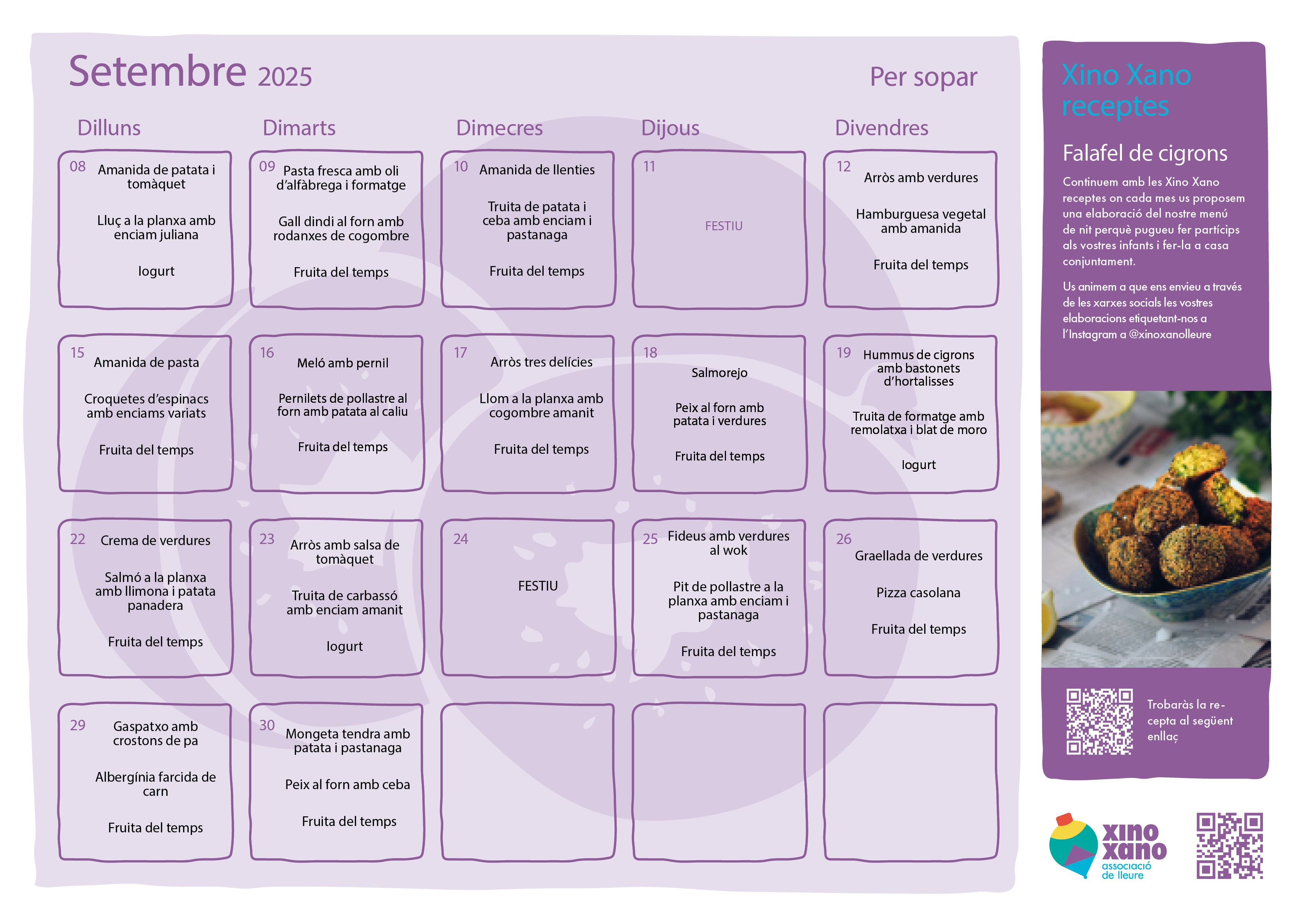 Aquí teniu el menú del mes de setembre així com la proposta de sopars que ens fa la dietista de Xino-Xano i tots els menús adaptats.