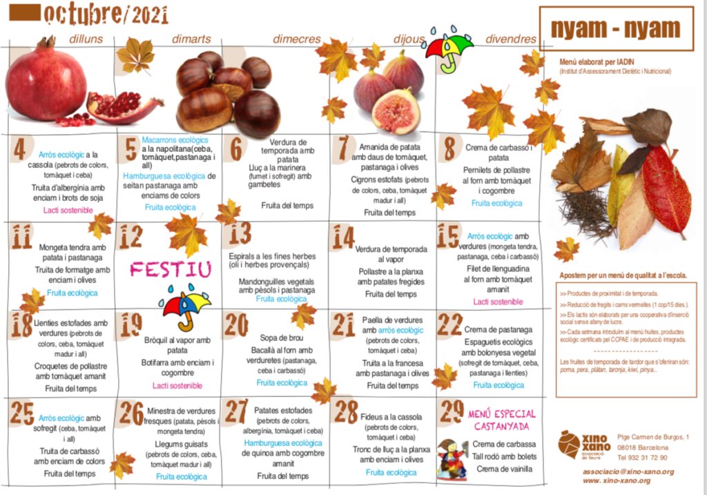 Us fem arribar el menú del servei de menjador que ha elaborat l’Institut d’Assessorament Dietètic i Nutricional (IADIN) per a Xino-Xano per al mes d’octubre.