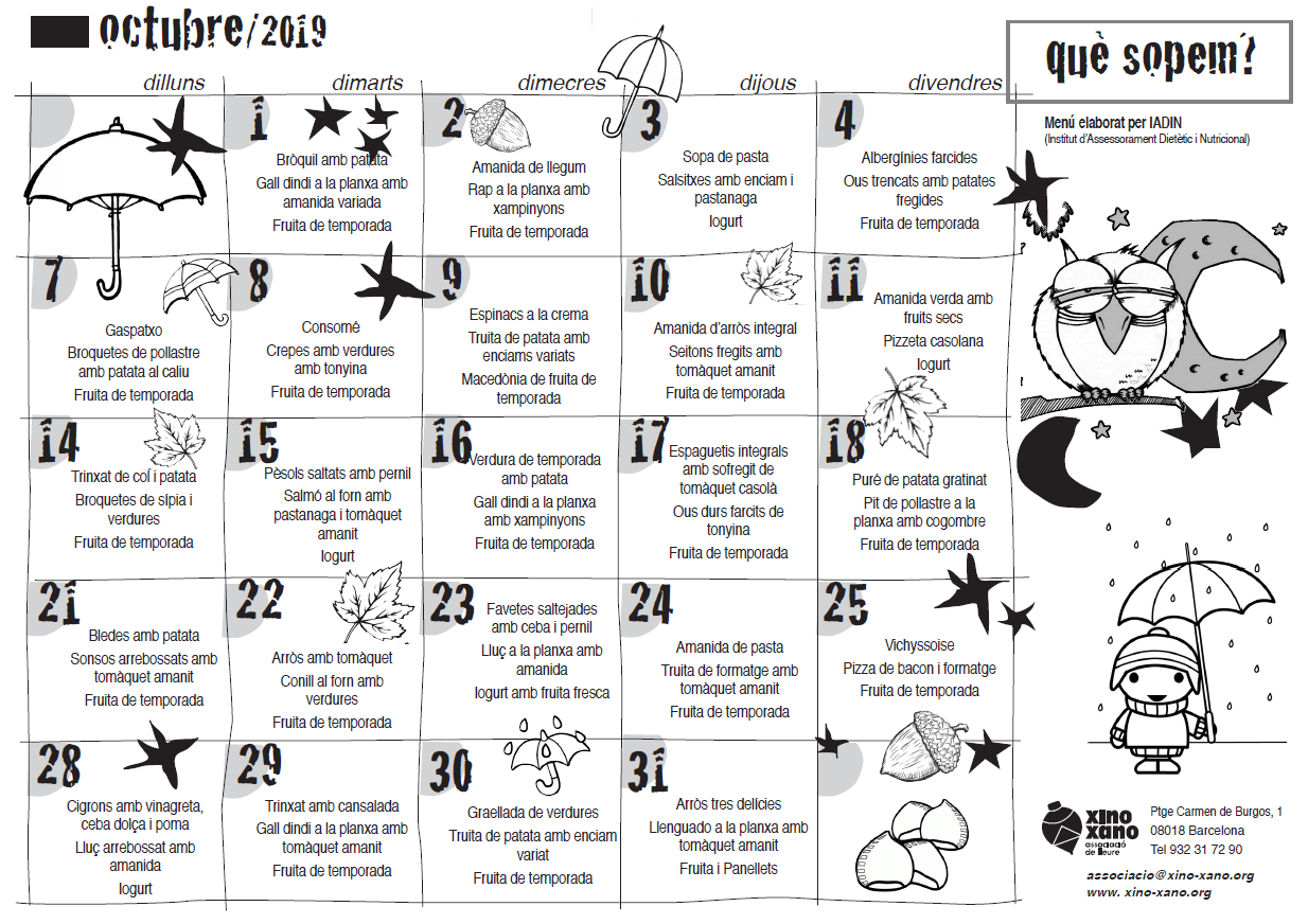 Us adjuntem el menú del servei de menjador previst per al mes d’octubre així com la proposta de sopars. Al nostre web també podreu trobar, properament, els menús adaptats a les diferents característiques dels nens i nenes que tenim actualment a l’escola.