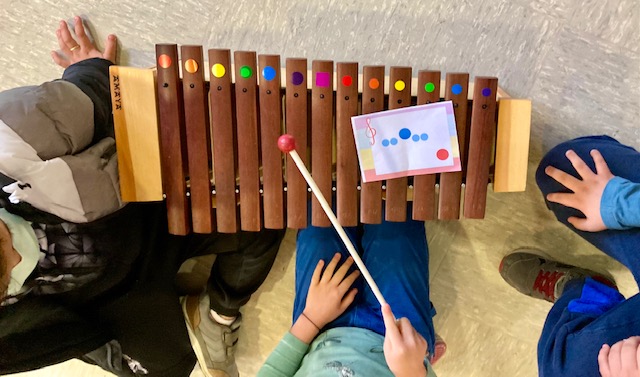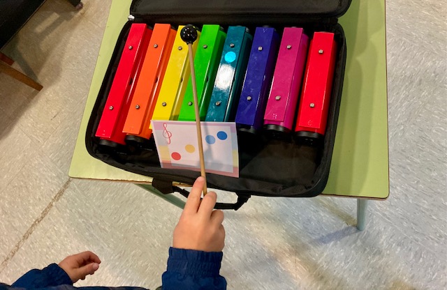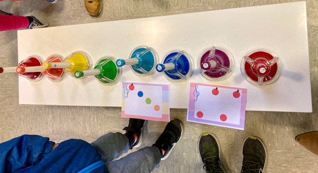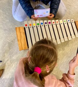 Per repassar les notes de l’escala, avui hem tocat petits patrons melòdics amb unes targetes que tenien les notes en colors, com els instruments de l’aula. Així hem pogut tocar i gaudir dels Boomwhackers, teclat, xilòfons, metal·lòfons i les campanes. Ens ho hem passat molt bé.