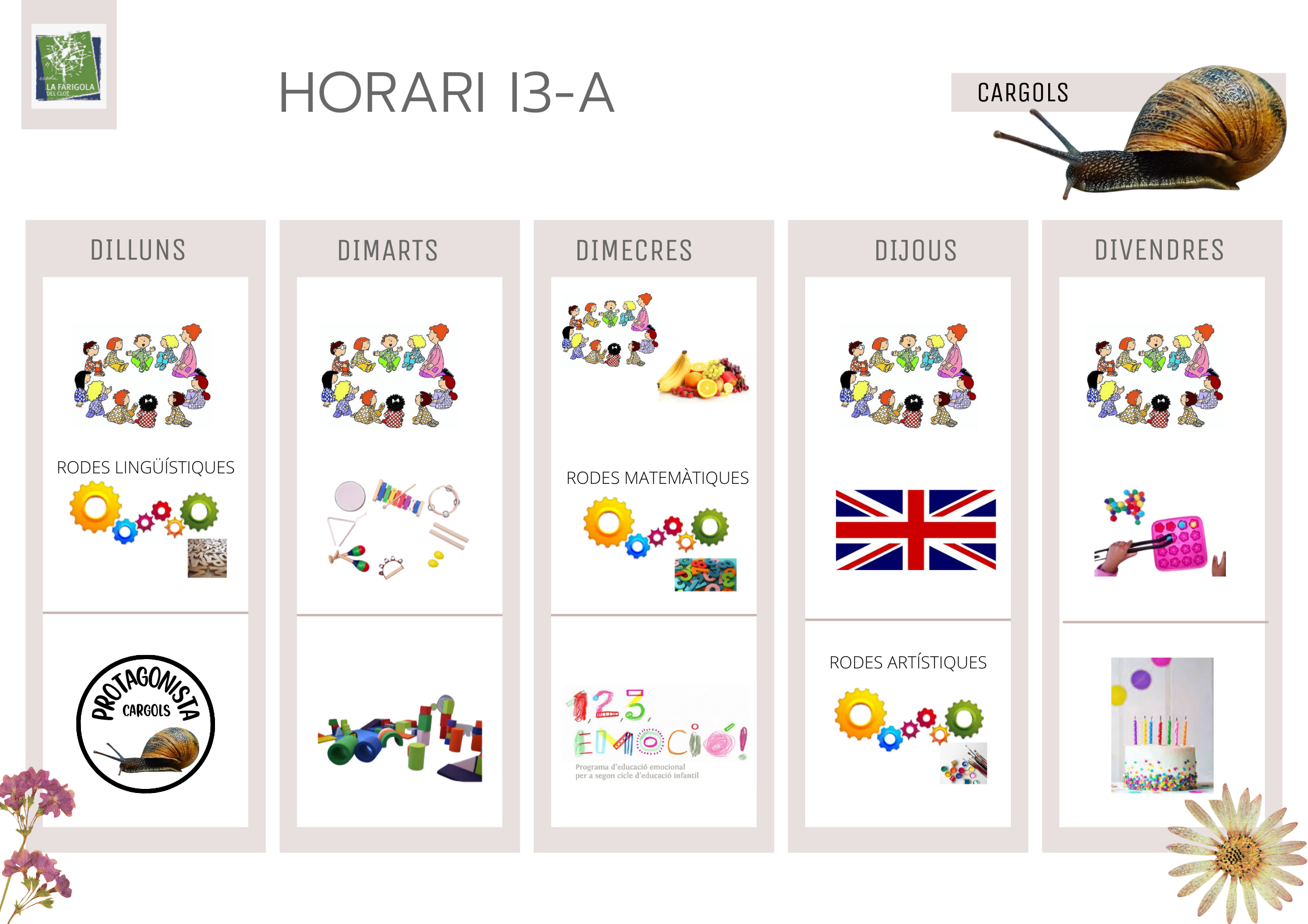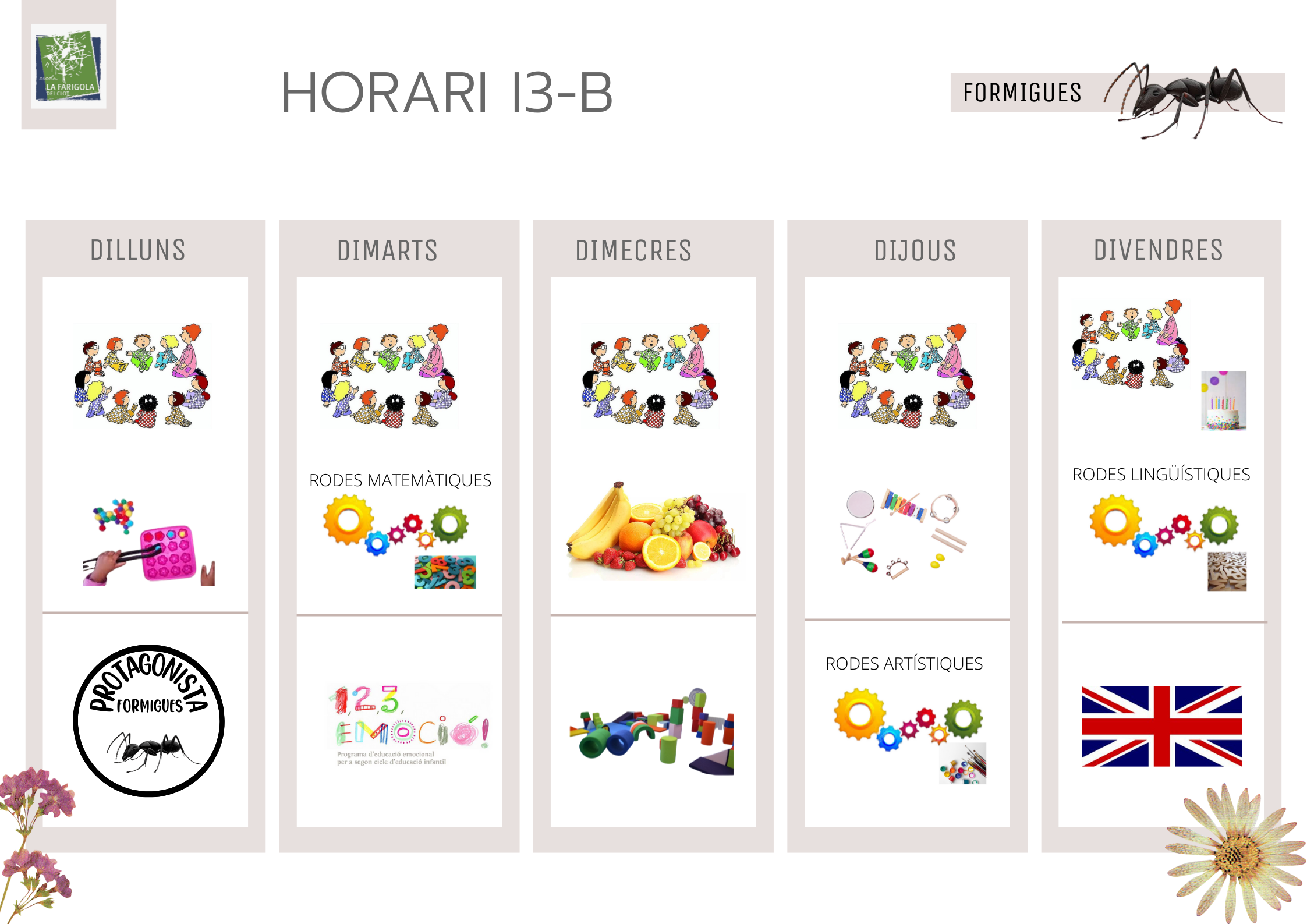 Què fem avui a I3? Feu un comentari / Per Pilar Prado Aquí teniu l’horari de la classe dels cargols i les formigues.