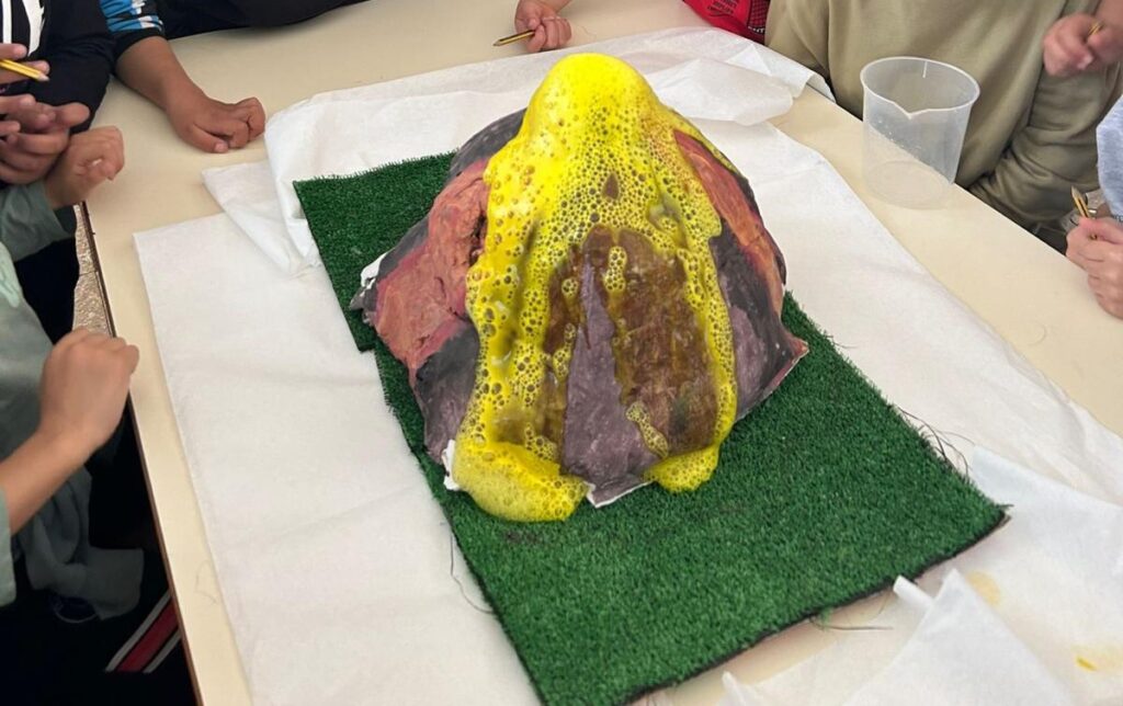 Estem emocionats i emocionades perquè hem fet l’experiment del volcà. Ens convertim en petits i petites científiques! Hem barrejat els ingredients: vinagre, bicarbonat i colorant. I el resultat ha sigut espectacular! Mireu, mireu…