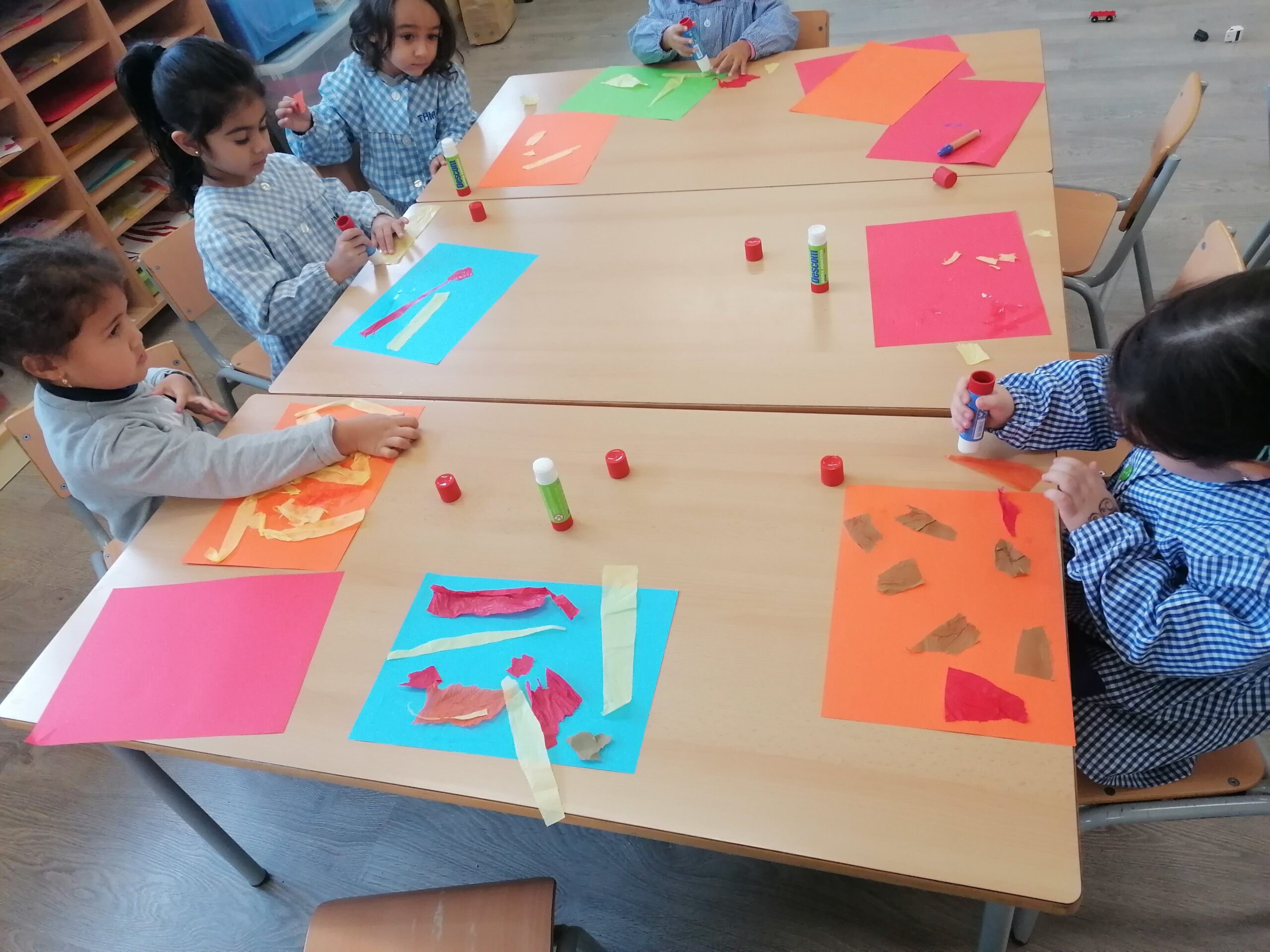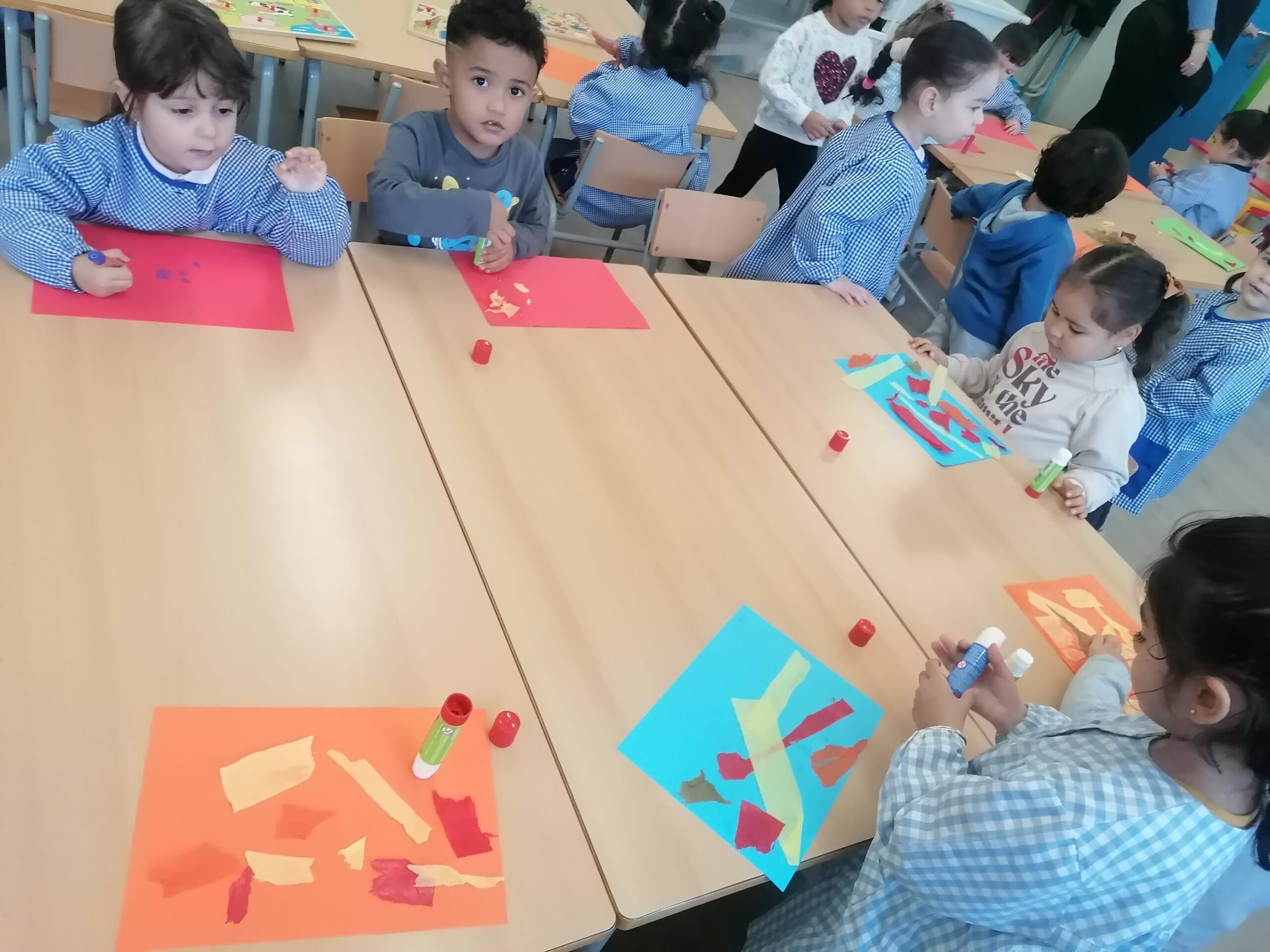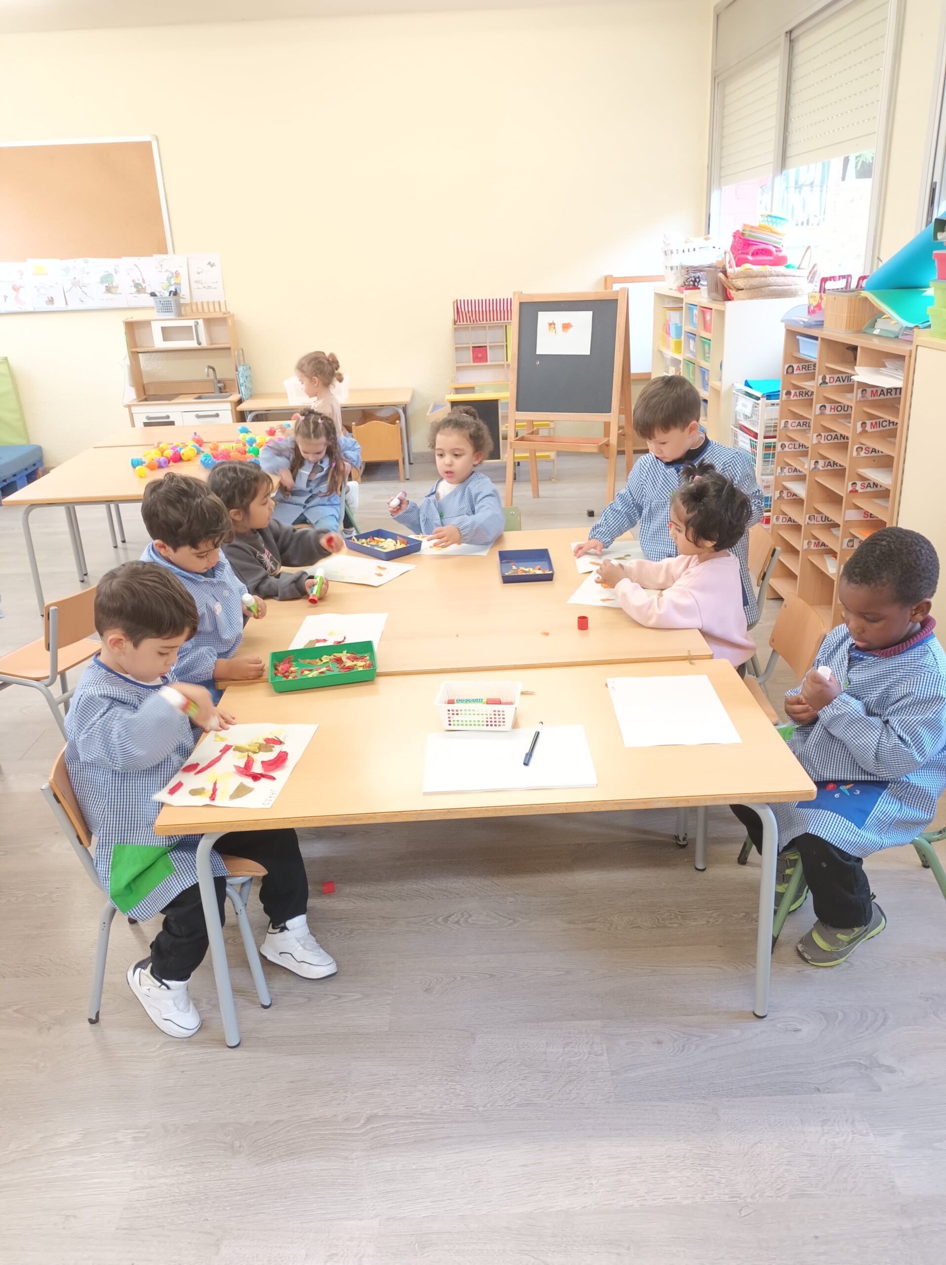 Estem aprenent a colorejar, enganxar gomets, esquinçar paper amb les nostres mans i enganxar-lo amb pegament al full, modelar…