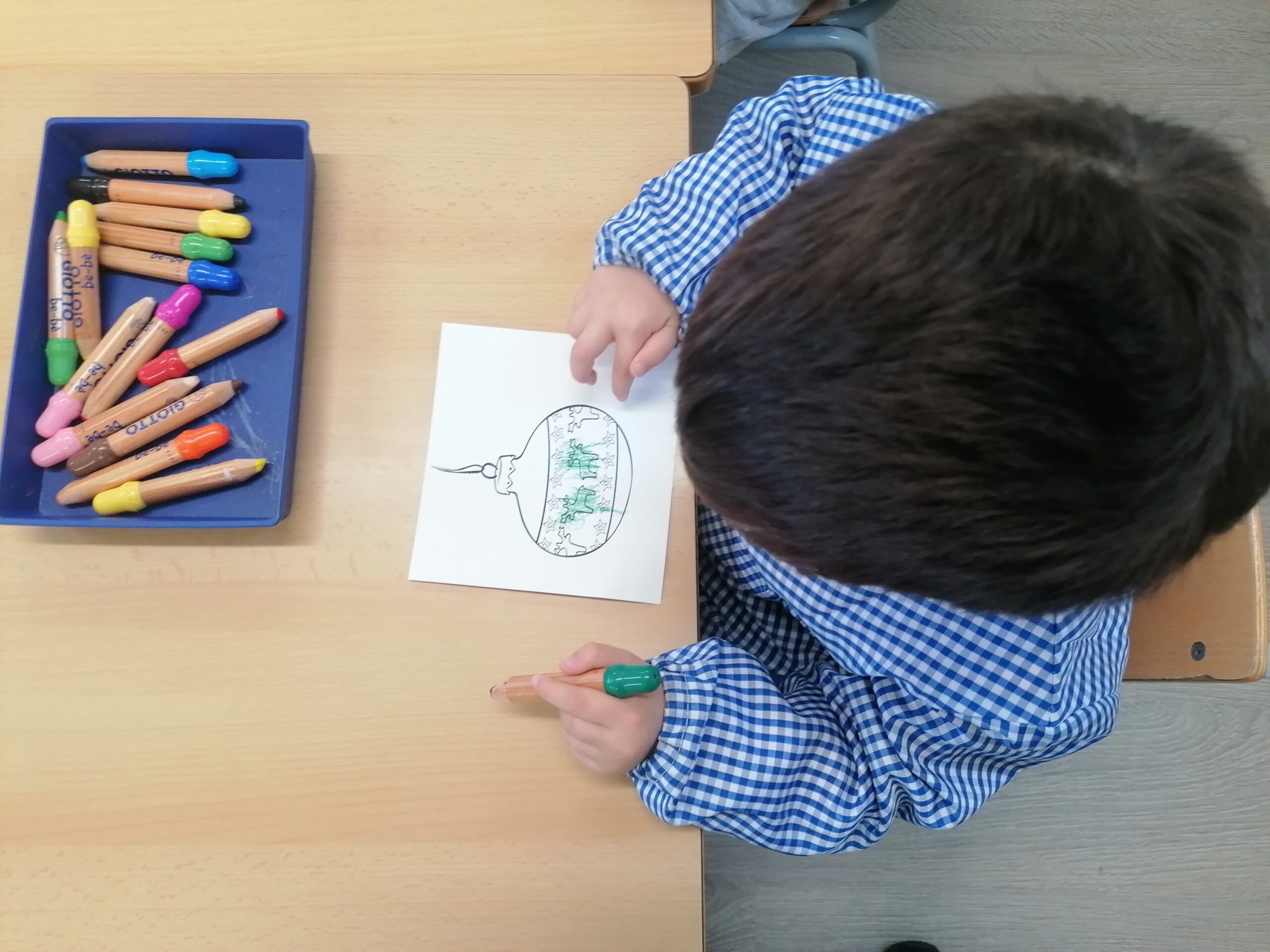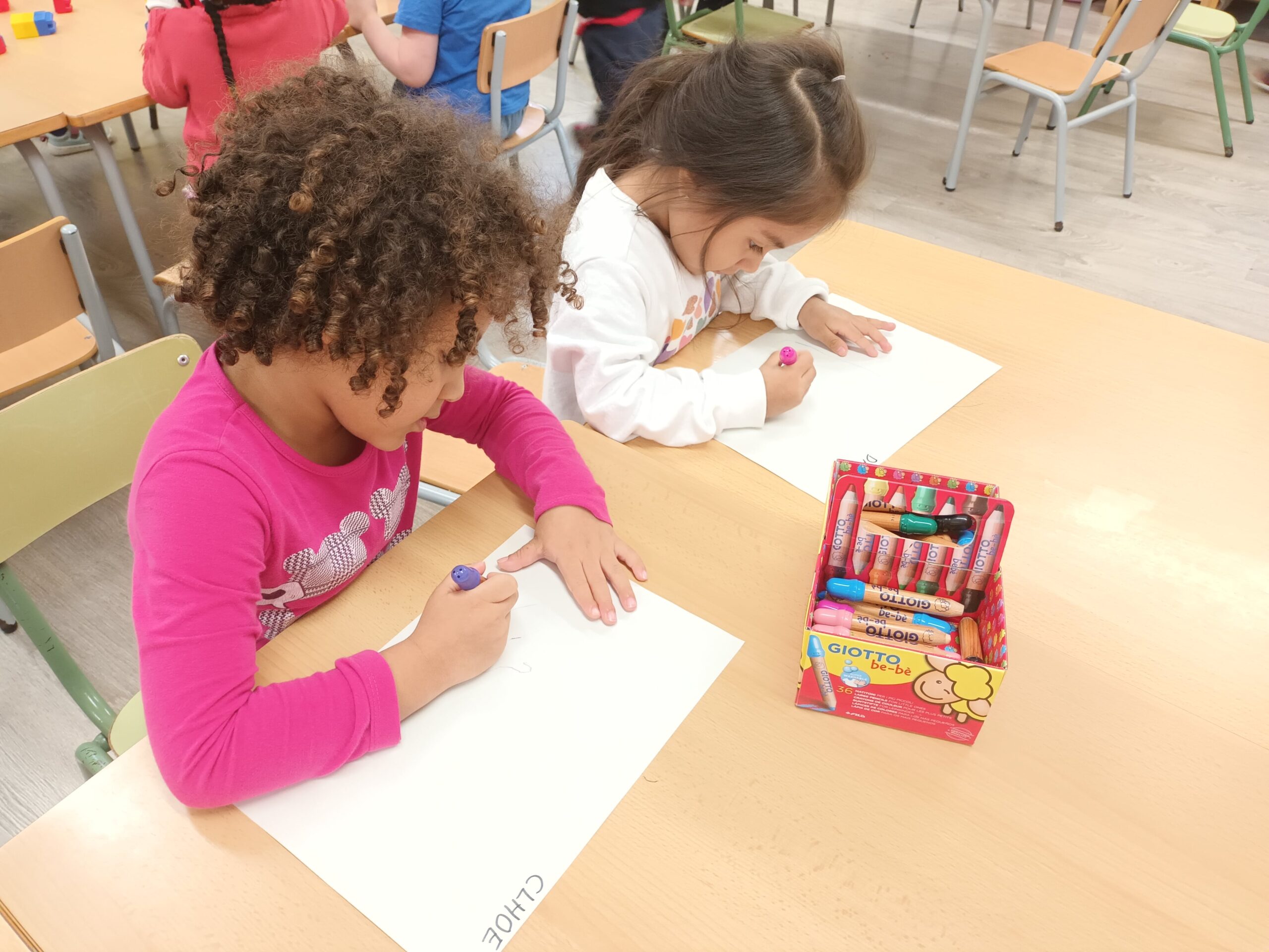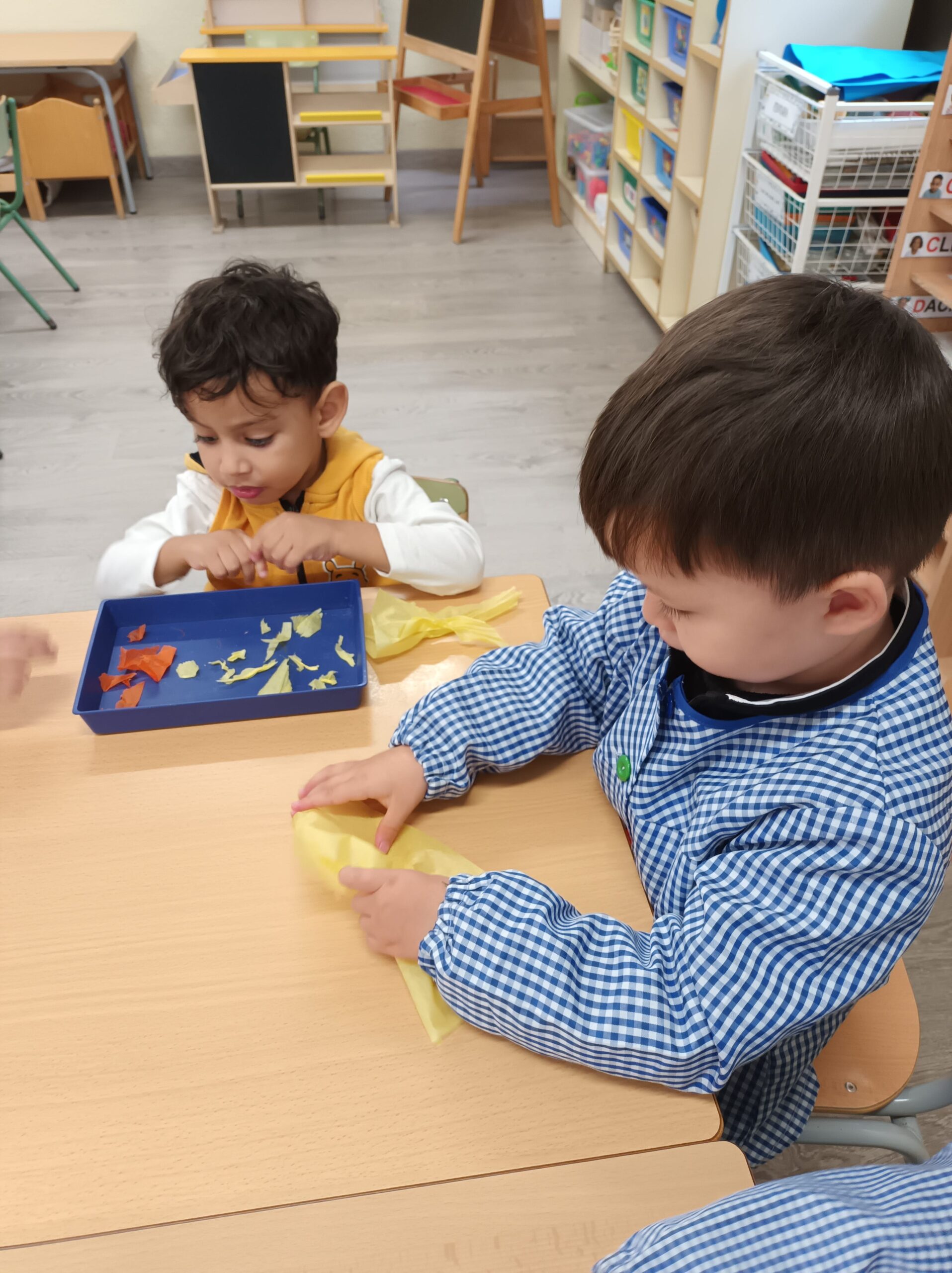 Estem aprenent a colorejar, enganxar gomets, esquinçar paper amb les nostres mans i enganxar-lo amb pegament al full, modelar…